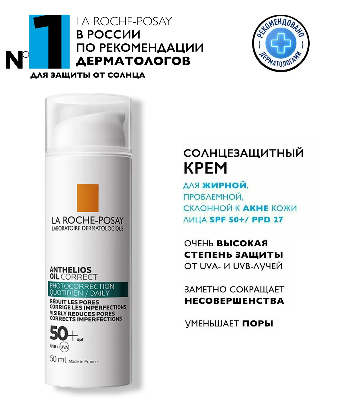 Крем LA ROCHE POSAY Солнцезащитный для жирной, проблемной, склонной к акне кожи лица Oil Correct SPF 50+/ PPD 27, 50 мл