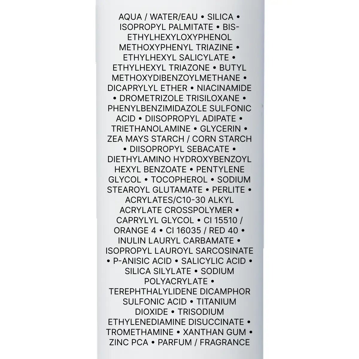 | Состав | aqua / water / eau, silica, isopropyl palmitate, bis-ethylhexyloxyphenol methoxyphenyl triazine, ethylhexyl salicylate, ethylhexyl triazone, butyl methoxydibenzoylmethane, dicaprylyl ether, niacinamide, drometrizole trisiloxane, phenylbenzimidazole sulfonic acid, diisopropyl adipate, triethanolamine, glycerin, zea mays starch / corn starch, diisopropyl sebacate, diethylamino hydroxybenzoyl hexyl benzoate, pentylene glycol, tocopherol, sodium stearoyl, glutamate, perlite, acrylates/c10-30 alkyl acrylate crosspolymer, caprylyl glycol, ci 15510 / orange 4, ci 16035 / red 40, inulin lauryl carbamate, isopropyl lauroyl sarcosinate, p-anisic acid, salicylic acid, silica silylate, sodium polyacrylate, terephthalylidene dicamphor sulfonic acid, titanium dioxide, trisodium ethylenediamine disuccinate, tromethamine, xanthan gum, zinc pca, parfum / fragrance |