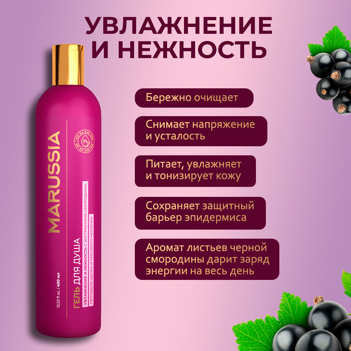 Marussia гель д душа 400 мл. увлажнение и нежность с экстрактом смородины, протеином шелка и риса
