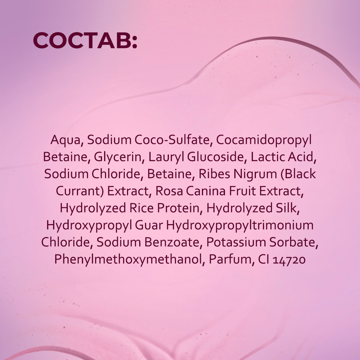 | Состав | Aqua, Sodium Coco Sulfate, Сocamidopropyl Betaine, Sodium Chloride, Decyl Glucoside, Glycerin, Phenoxyethanol, Ethylhexylglycerin, Parfum, Citric Acid, Chamerion Аngustifolium Extract, Hydrolyzed Silk Peptides, Panthenol, Rosae Рingue Fructuum Extract, Thyme Extract, Tilia Сordata Еxtract, CI 19140, CI 15985 |