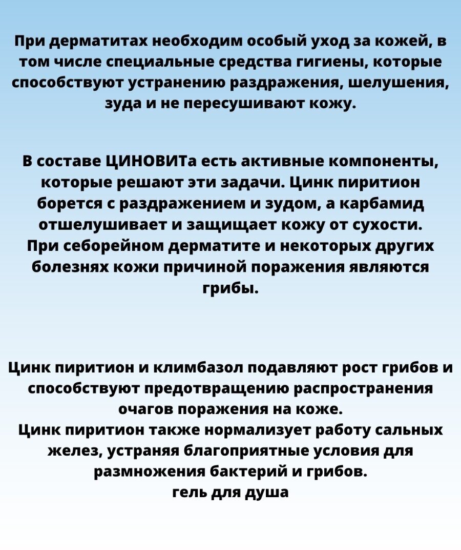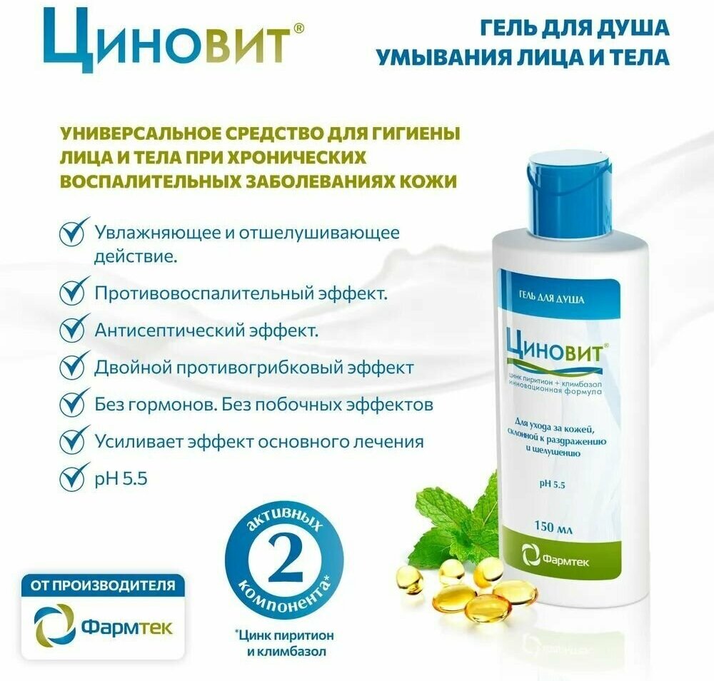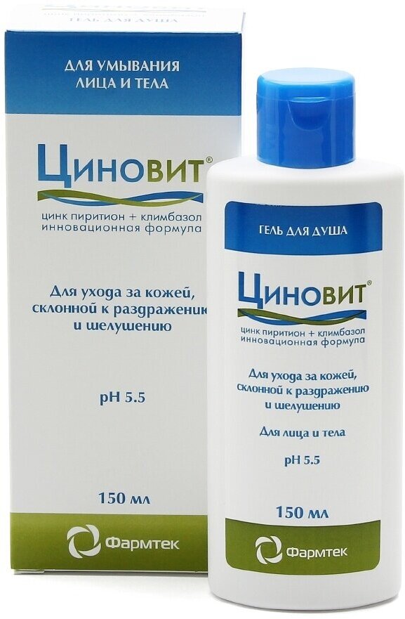 | Способ применения | перед применением несколько раз встряхните флакон. Небольшое количество геля равномерно распределите по всей поверхности кожи и оставьте на 2 – 3 минуты, затем смойте теплой водой. ЦИНОВИТ следует применять как единственное средство для мытья кожи тела и лица в течение всего периода лечения дерматита (атопический дерматит, экзема, себорейный дерматит и другие) или грибковых заболеваний кожи. Затем можно применять гель с профилактической целью 1 – 2 раза в неделю |