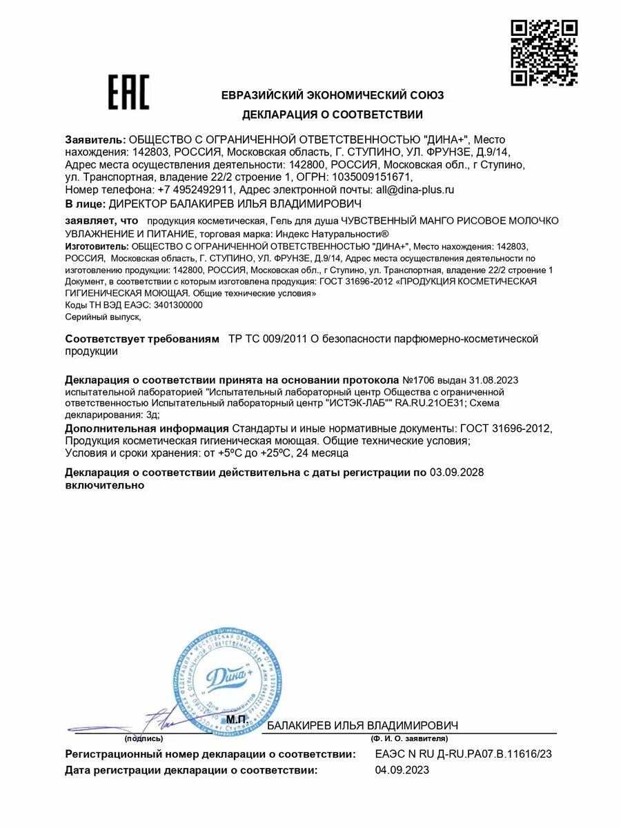 Очищающий гель для душа без сульфатов, Чувственный Манго, 400ml индекс натуральности