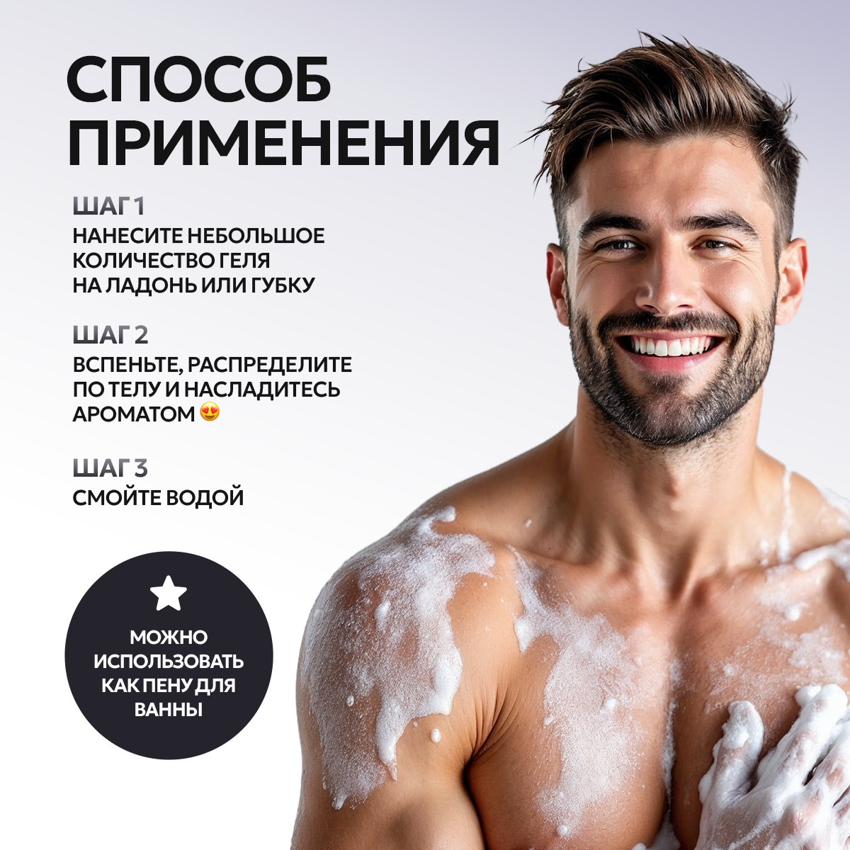 | Способ применения | Нанести небольшое количество геля на ладонь или губку, вспеньте, распределите по телу массирующими движениями, смойте водой. |