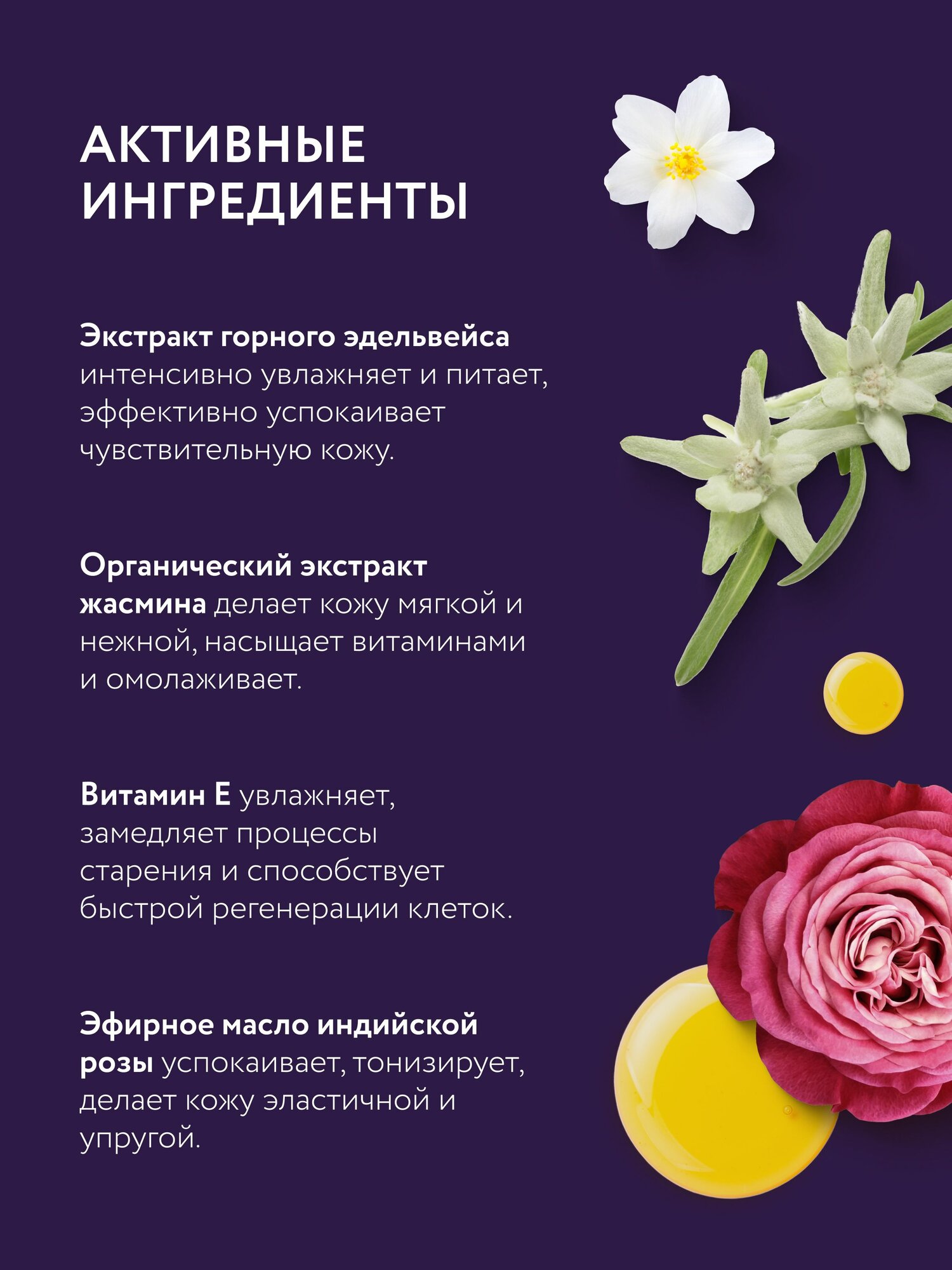 | Состав | Aqua with infusions of Organic Leontopodium Alpinum Flower/Leaf Extract (органический экстракт горного эдельвейса), Organic Jasminum Officinale Flower Extract (органический экстракт жасмина), Glycerin, Helianthus Annuus Seed Oil, Cetearyl Alcohol, Glyceryl Stearate, Coco-Caprylate/Caprate, Caprylic/Capric Triglyceride, Sodium Cetearyl Sulfate, Tocopheryl Acetate (витамин Е), Xanthan Gum, Rosa Chinensis Flower Oil (эфирное масло индийской розы), Benzyl Alcohol, Ethylhexylglycerin, Citric Acid, Parfum, Benzyl Salicylate, Alpha-Isomethyl Ionone, Citronellol, Limonene, CI 28440, CI 14720. |