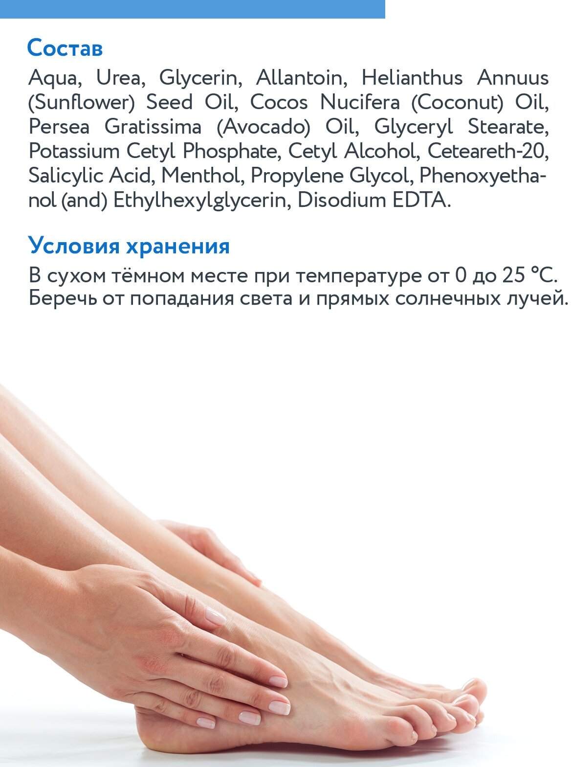 | Состав | Aqua, Urea, Glycerin, Allantoin, Helianthus Annuus (Sunflower) Seed Oil, Cocos Nucifera (Coconut) Oil, Persea Gratissima (Avocado) Oil, Glyceryl Stearate, Potassium Cetyl Phosphate, Cetyl Alcohol, Ceteareth-20, Salicylic Acid, Menthol, Propylene Glycol, Phenoxyethanol (and) Ethylhexylglycerin, Disodium EDTA. |