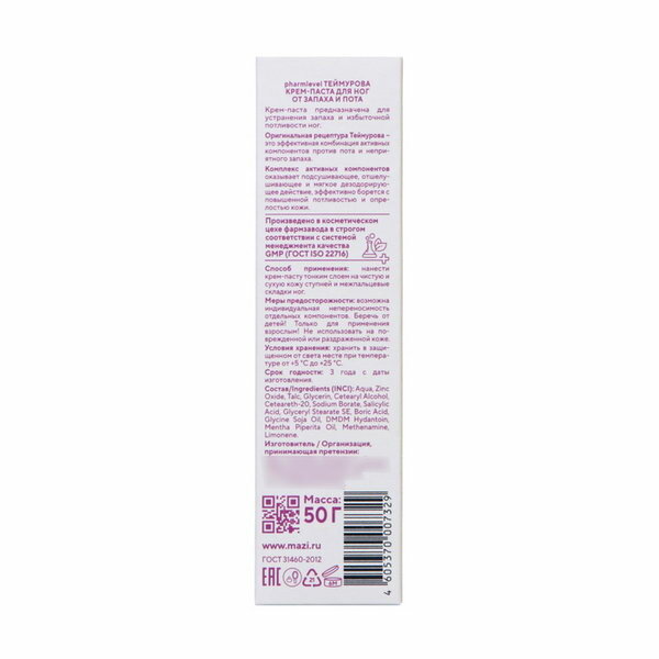 Крем - паста для ног / Теймурова / от запаха и пота / 50мл.