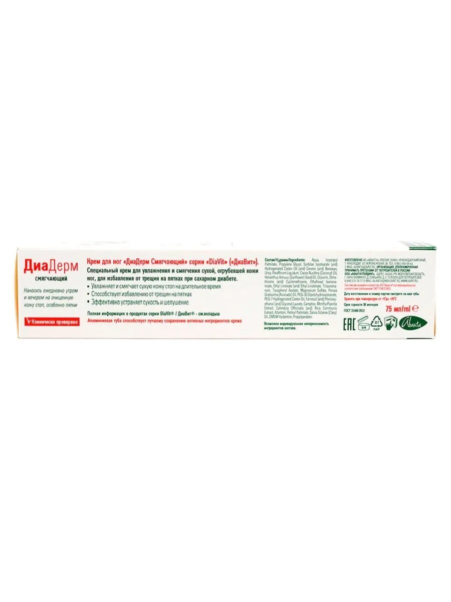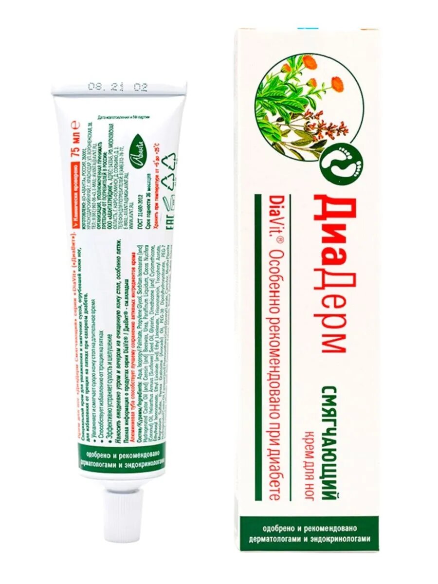 DiaVit Крем для ног ДиаДерм смягчающий для больных сахарным диабетом, 75 мл, 21 шт