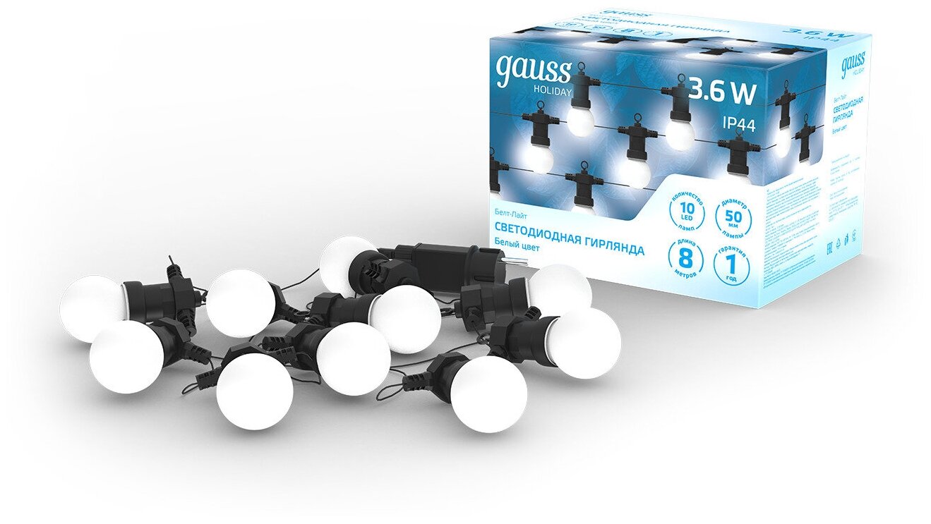 Светодиодная гирлянда Gauss Белт Лайт серия Holiday, 10 ламп, 7,7 м, IP44, белый, 1/6