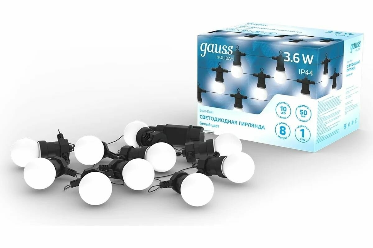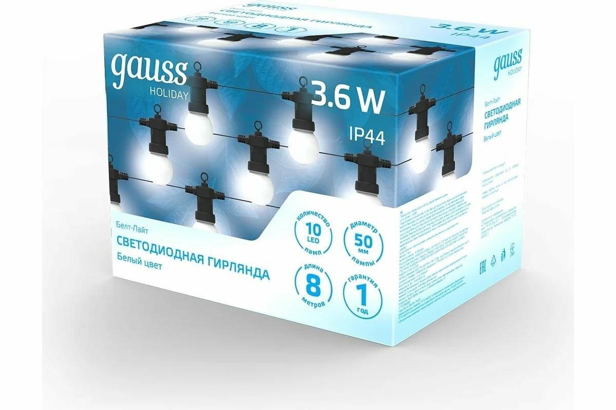 Светодиодная гирлянда Gauss Белт Лайт серия Holiday, 10 ламп, 7,7 м, IP44, белый, 1/6