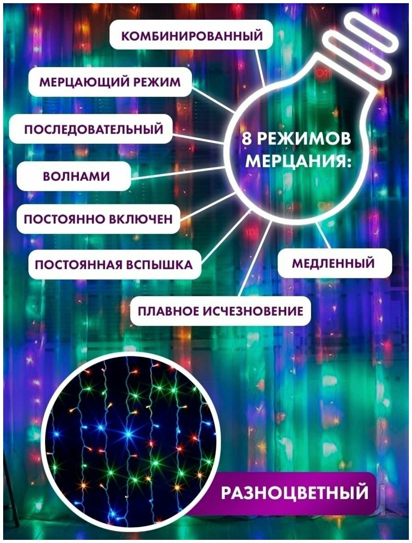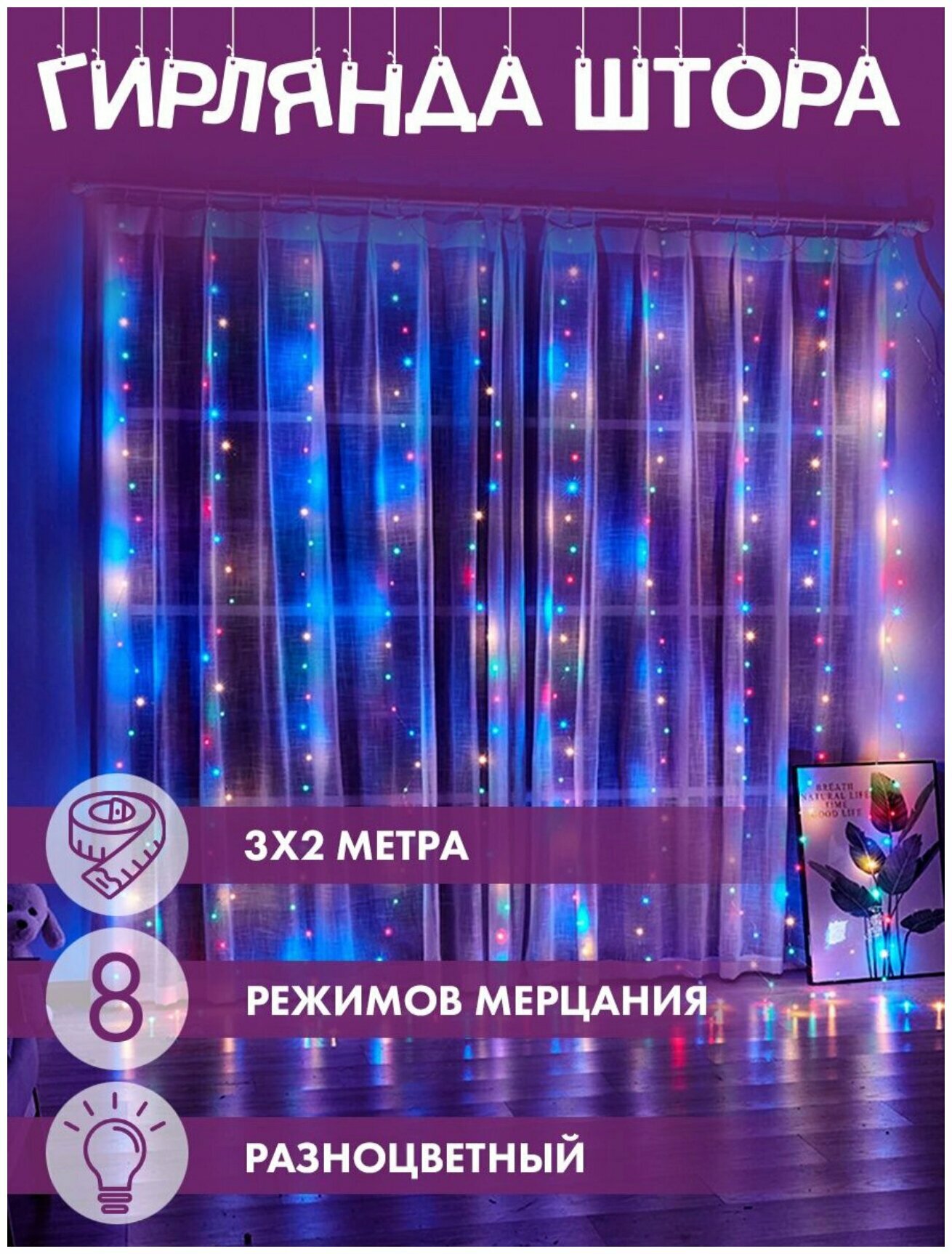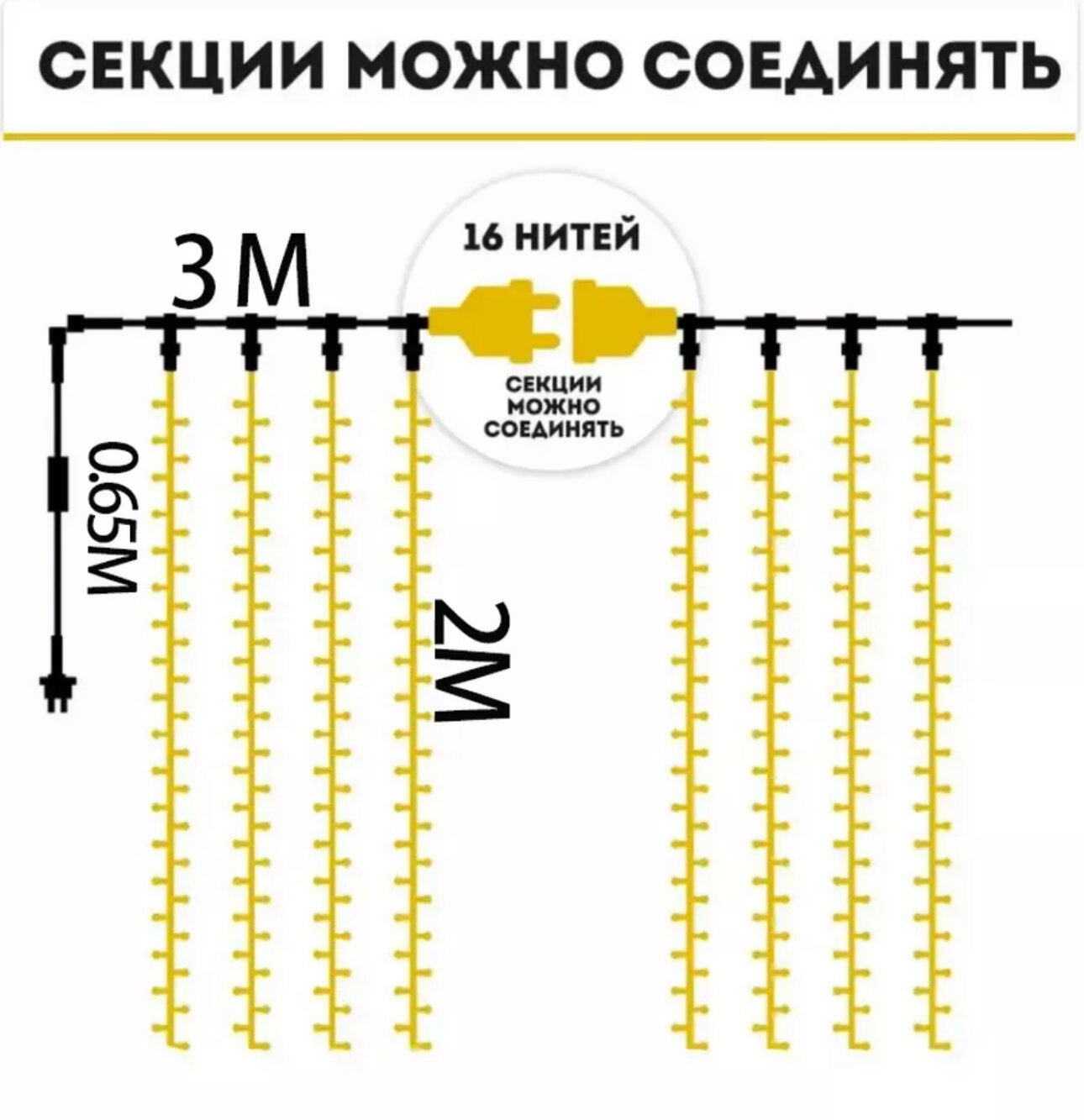 | Дополнительная информация | Мягкий теплый свет. - Гирлянда занавес, Гирлянда штора 3х2 метра самый оптимальный размер - В комплекте 2 вилки, одна для подключения в сеть 220В, другая вилка штекер для соединения с другими гирляндами (при желании удлинить) |