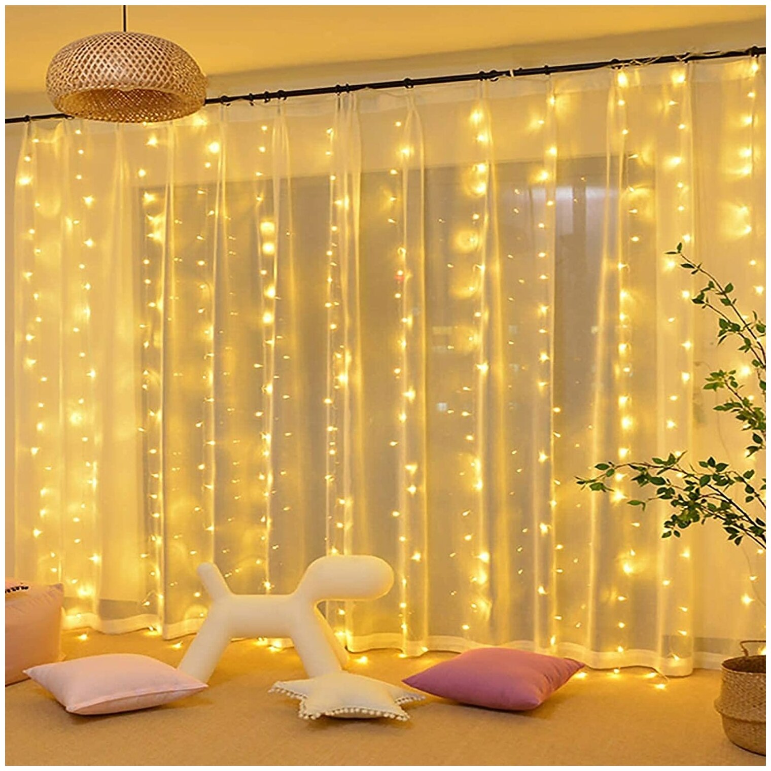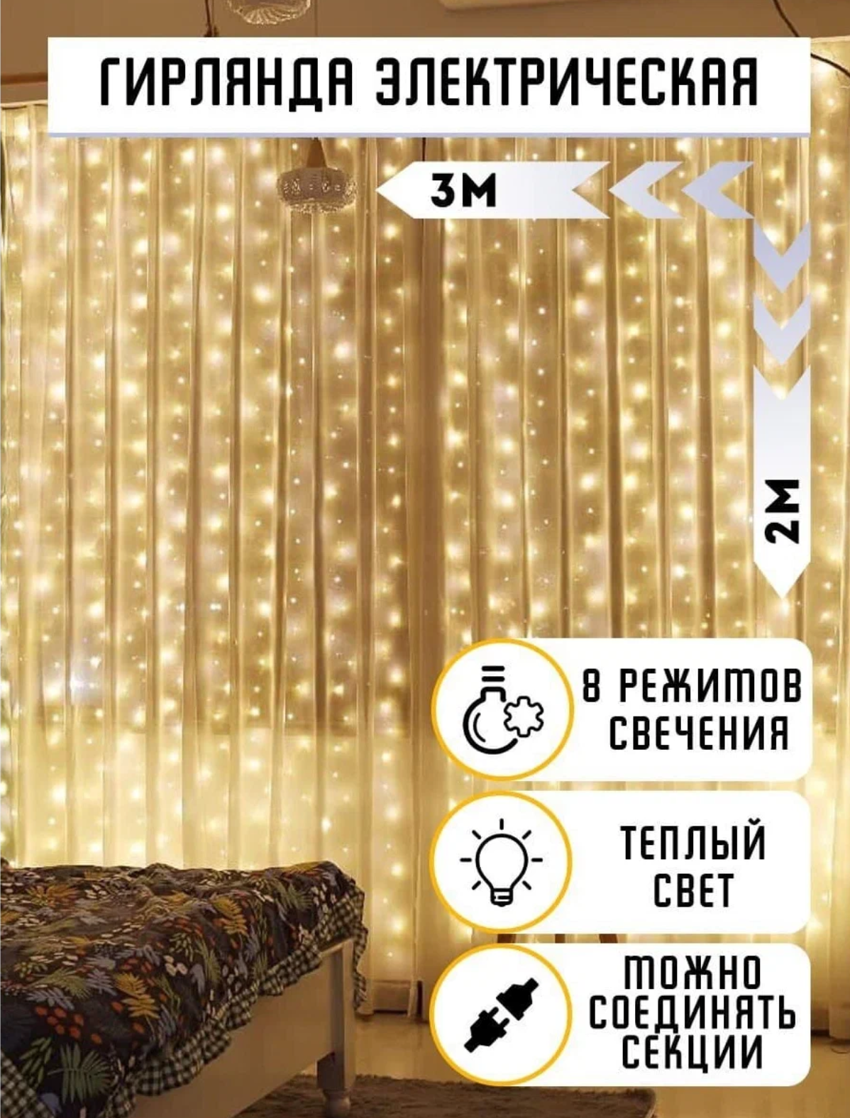 Купить Гирлянда электрическая светодиодная 3х2 метра / Гирлянда штора занавес новогодняя, желтый