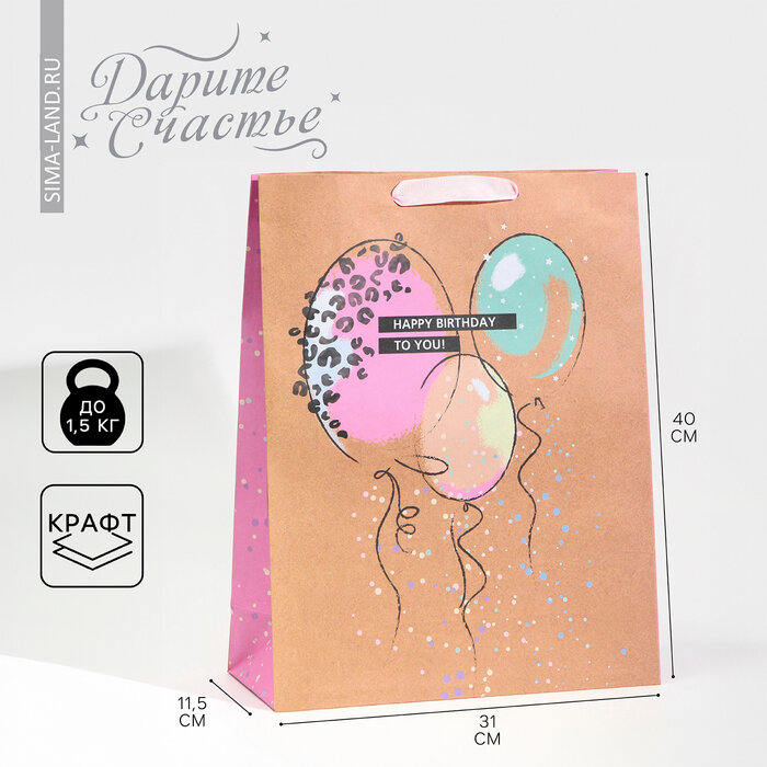Пакет подарочный крафтовый, упаковка, "С днём рождения", 22 x 25 x 12 см