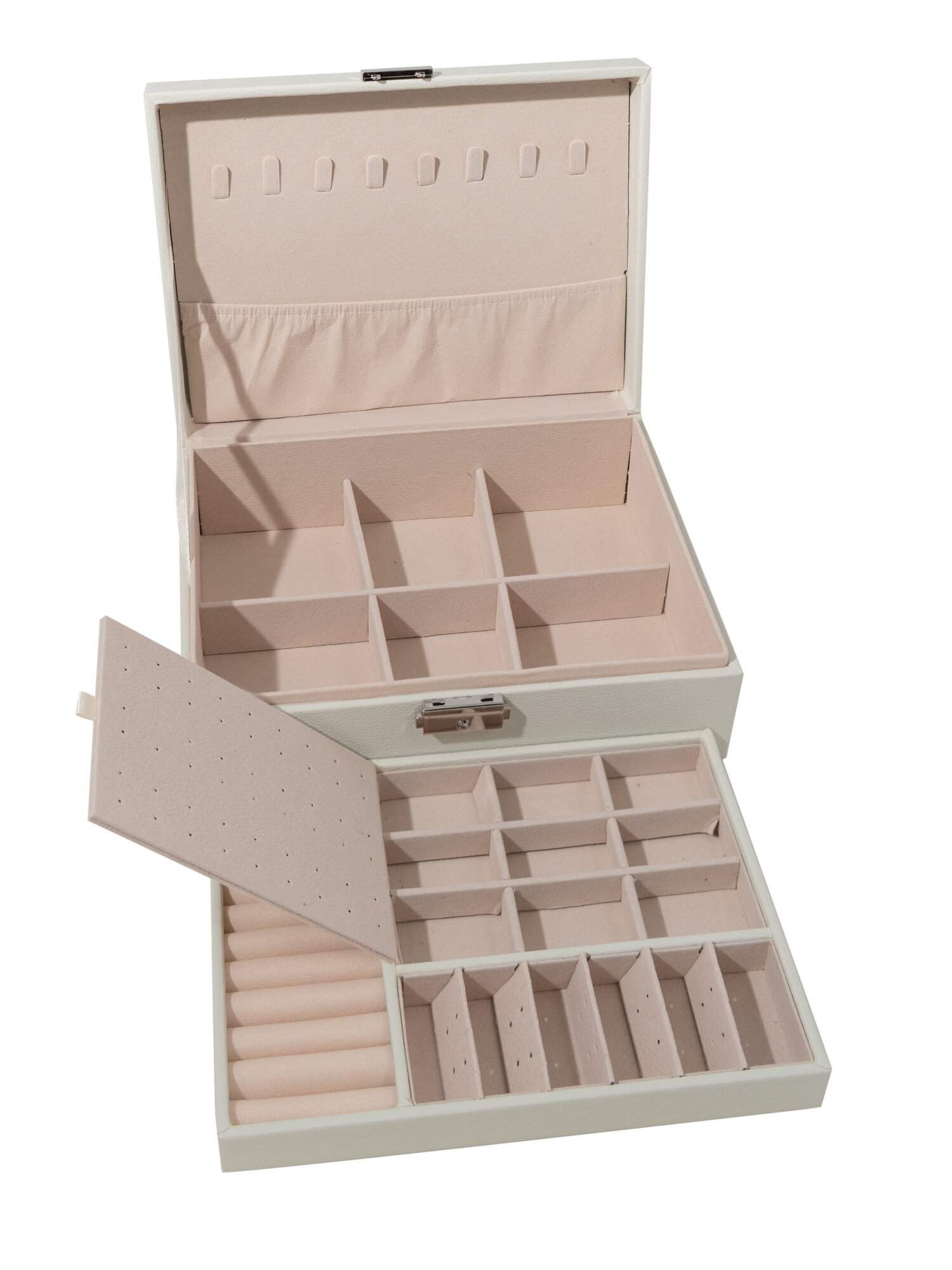 Шкатулка для украшений, органайзер для хранения бижутерии, эко-кожа, светло-бежевый, молочный оттенок, 14 отделений, 2 яруса, на замке