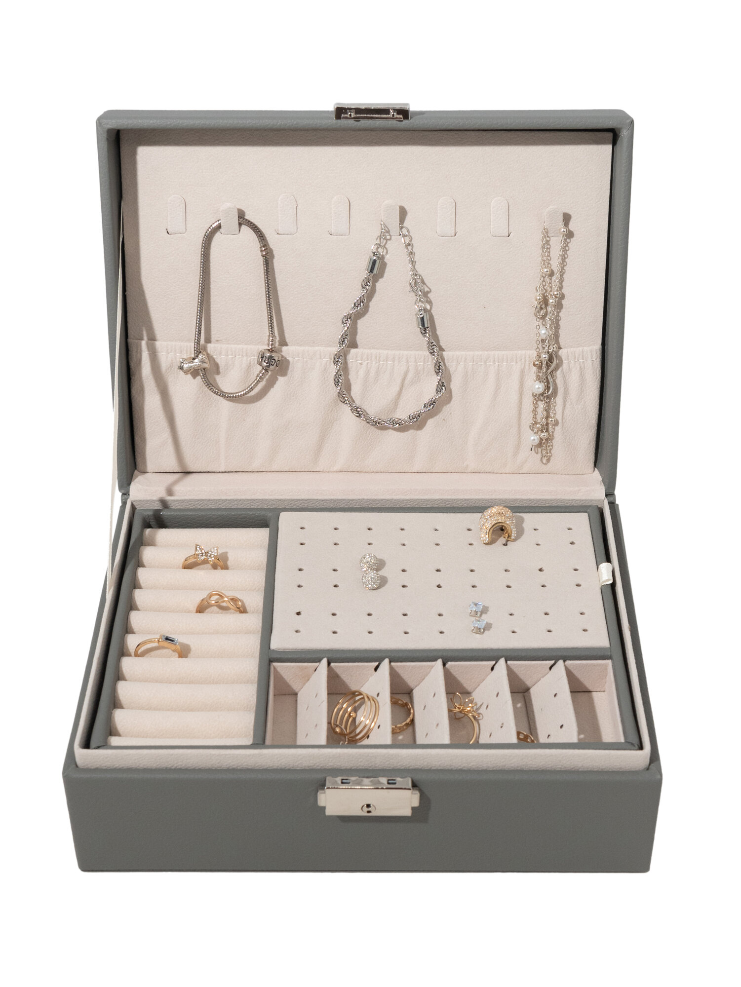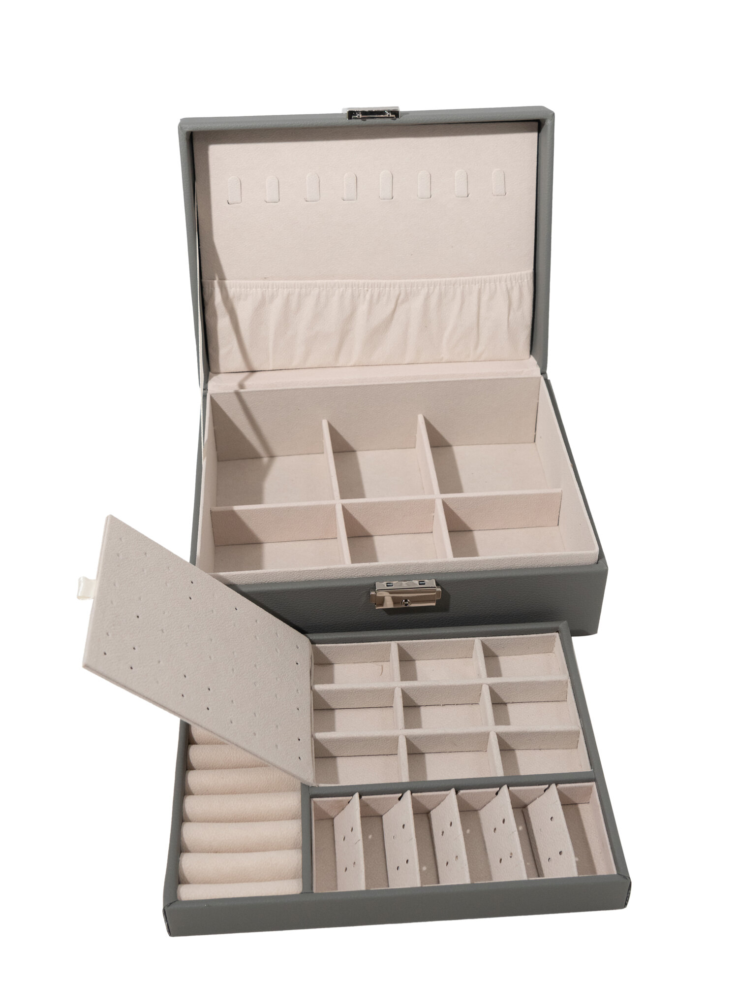 Купить Шкатулка для украшений, органайзер для хранения бижутерии, эко-кожа, серый, 14 отделений, 2 яруса, на замке