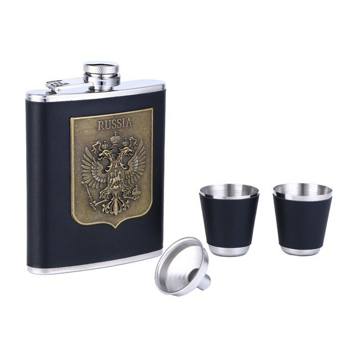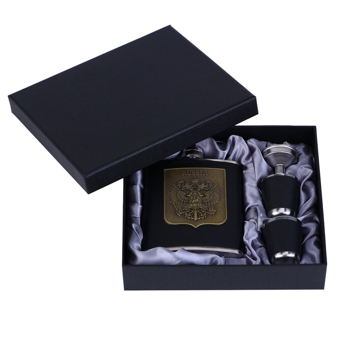 Купить Подарочный набор 4 в 1 «Герб России»: фляжка 210 мл, воронка, 2 рюмки, черный, 17×20 см