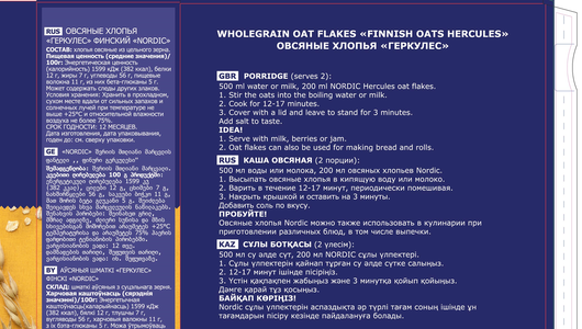 | Способ приготовления | Первый способ приготовления – это варка каши в кастрюле. Второй – приготовление в микроволновой печи. Общее время приготовления обычно занимает не больше 3 минут. Процесс поэтапно выглядит следующим образом: Берем 500 мл молока или воды и 250 граммов хлопьев «Нордик». Высыпаем хлопья в молоко или кипящую воду. Варим в течение 1 минуты / постоянно помешивая. Накрываем кашу крышкой / оставляем ее «доходить» еще 2 минуты. При желании можно добавить в кашу соль / сахар / варенье / йогурт. Производитель указывает / что хлопья могут стать прекрасной основой для булочек. |
