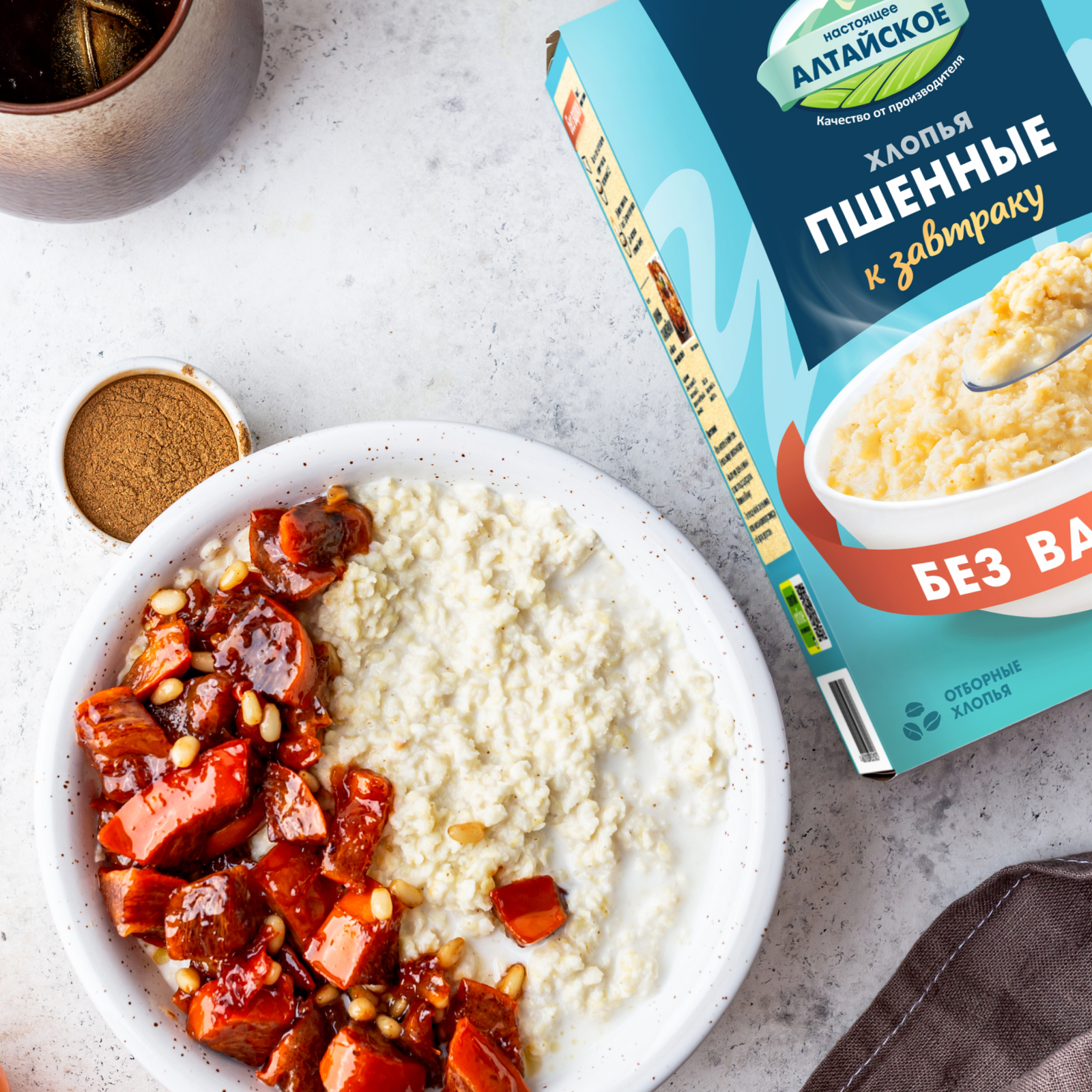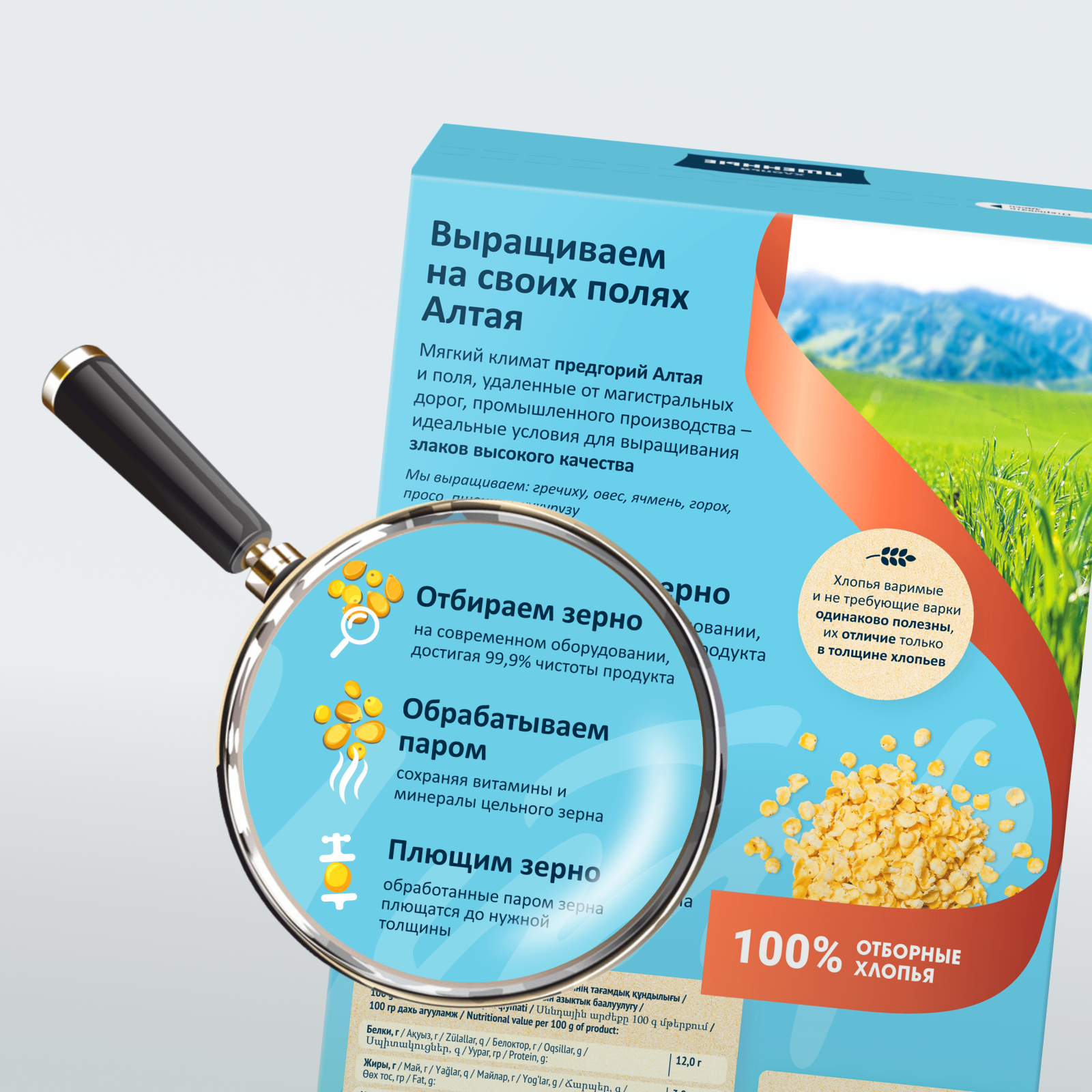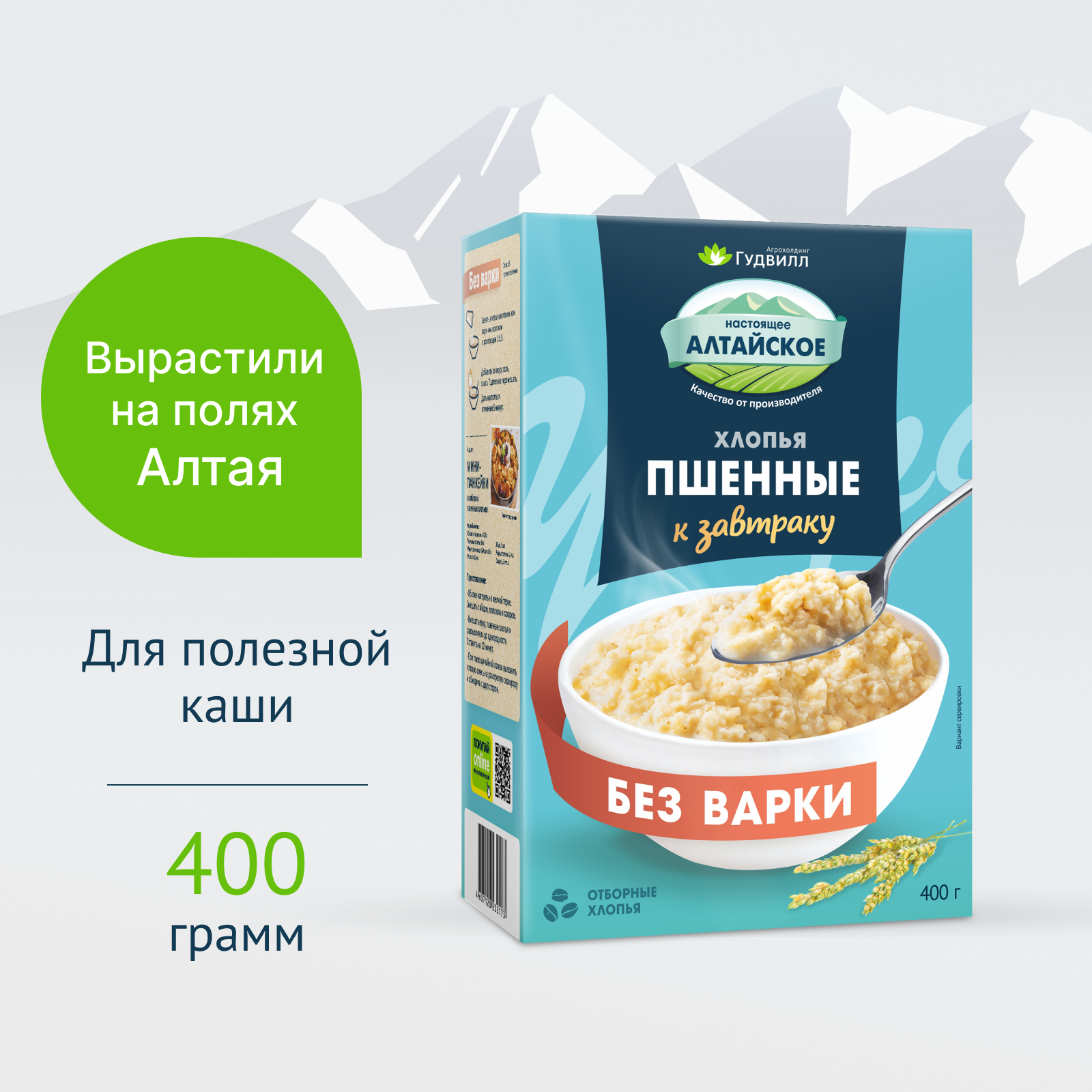 | Дополнительная информация | Пшенные хлопья производятся из зерна, выращенного на полях Агрохолдинга Гудвилл в предгорьях Алтая. Хлопья не требуют варки, что делает ваш завтрак удобным и быстрым в приготовлении. Зерно обрабатывается паром, проходит процесс плющения и от того на сколько зерно расплющено и зависит его дальнейшее время приготовления. |