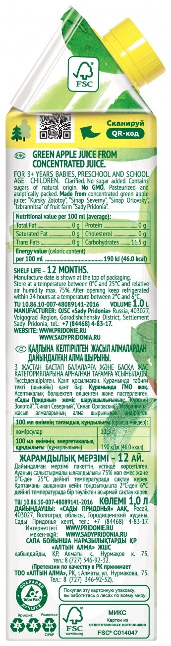 | Состав | концентрированный яблочный сок из зеленых яблок сортов: «курский золотой», «синап северный», «синап орловский», «избранница» |