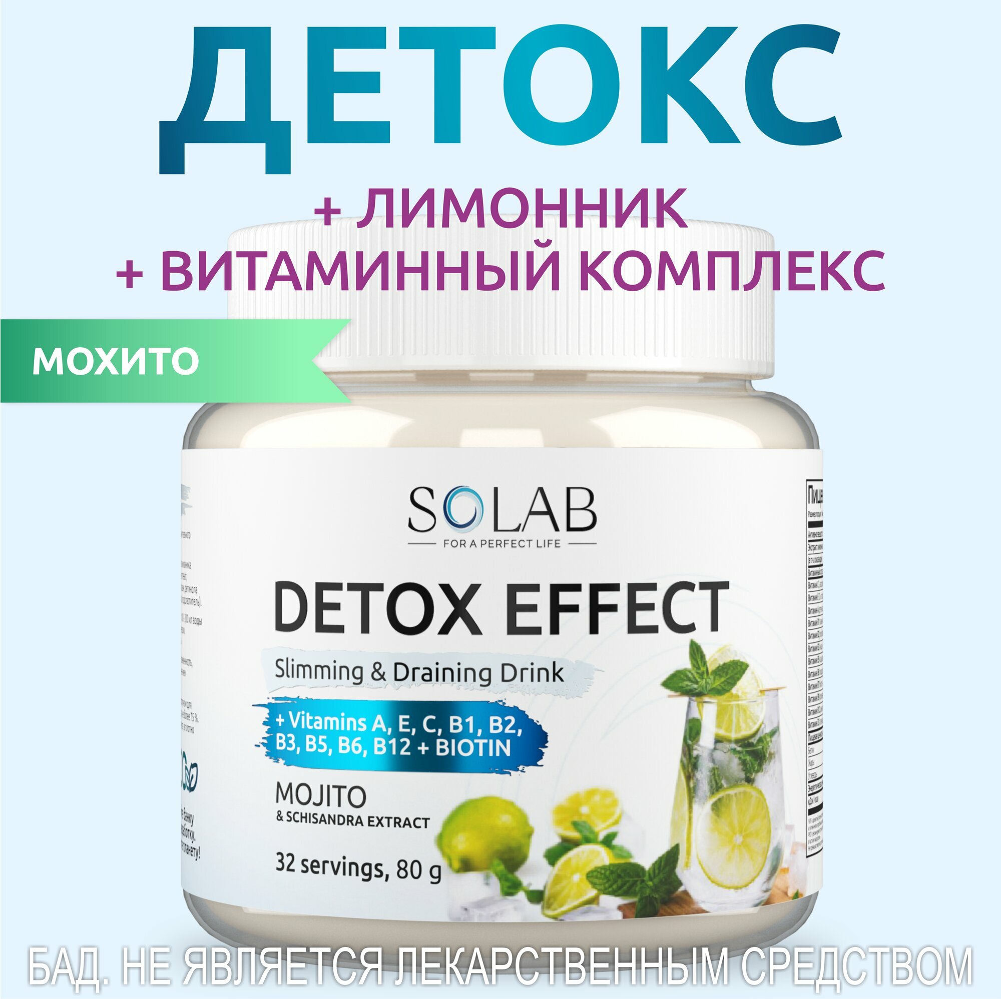 SOLAB Фитококтейль детокс Detox Slim Effect со вкусом лайм-лимон, 32 порции с экстрактом лимонника для похудения, очищения