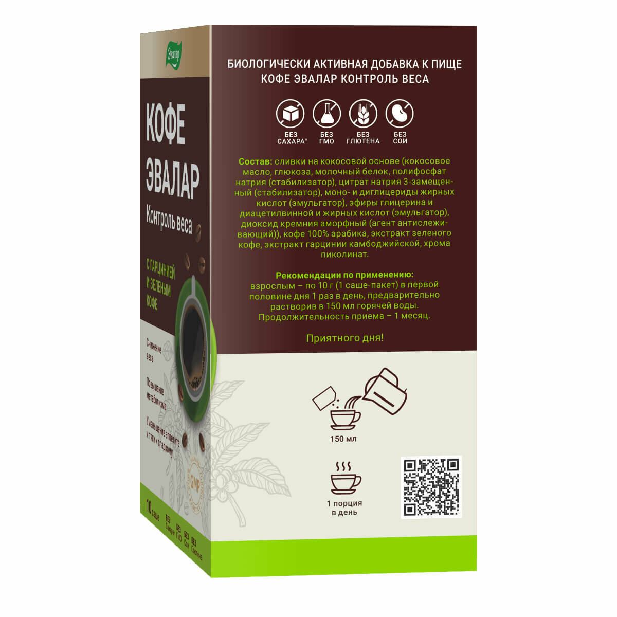| Состав | Сливки кокосовые из мякоти кокоса, кофе 100% арабика, экстракт зеленого кофе, экстракт гарцинии камбоджийской, пиколинат хрома. |