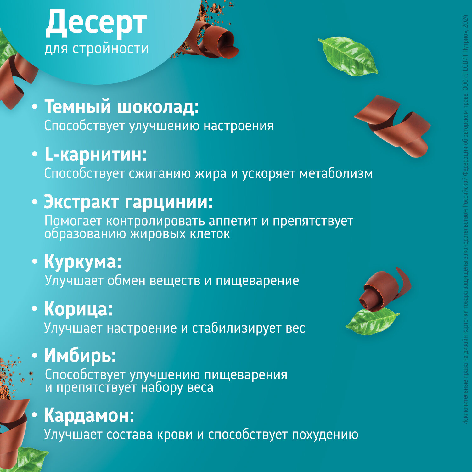 | Состав | мальтодекстрин, какао-порошок, заменитель сливок (кукурузный сироп, растительное масло, молочный белок), крахмал картофельный, пищевые волокна (инулин), шоколад (какао тертое, сахар, какао-порошок, масло какао, эмульгатор-лецитин соевый), L-карнитин, экстракт гарцинии камбоджийской, куркума, корица, имбирь, кардамон, соль, антиокислитель – аскорбиновая кислота, подсластитель – сукралоза, ванилин. |
