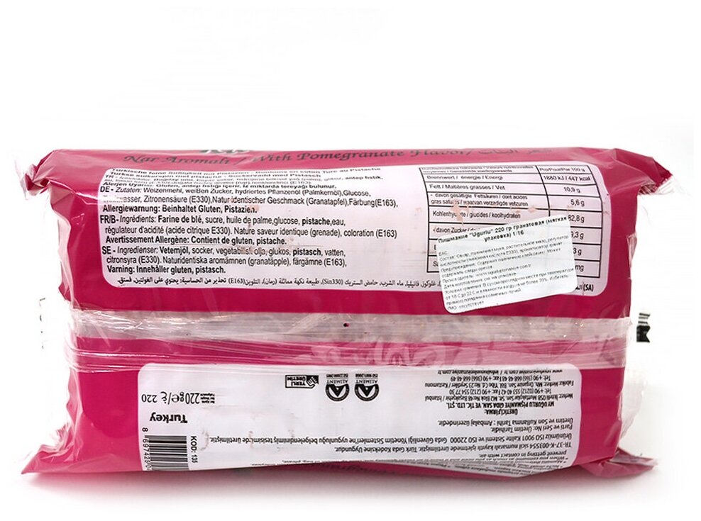 | Состав | Сахар, пшеничная мука,фисташки, растительное мало(пальмовое), регулятор кислотности (лимонная кислота Е330),вода питьевая, ванилин. Предупреждение: Содержит пшеничную клейковину. Может содержать следы орехов. |
