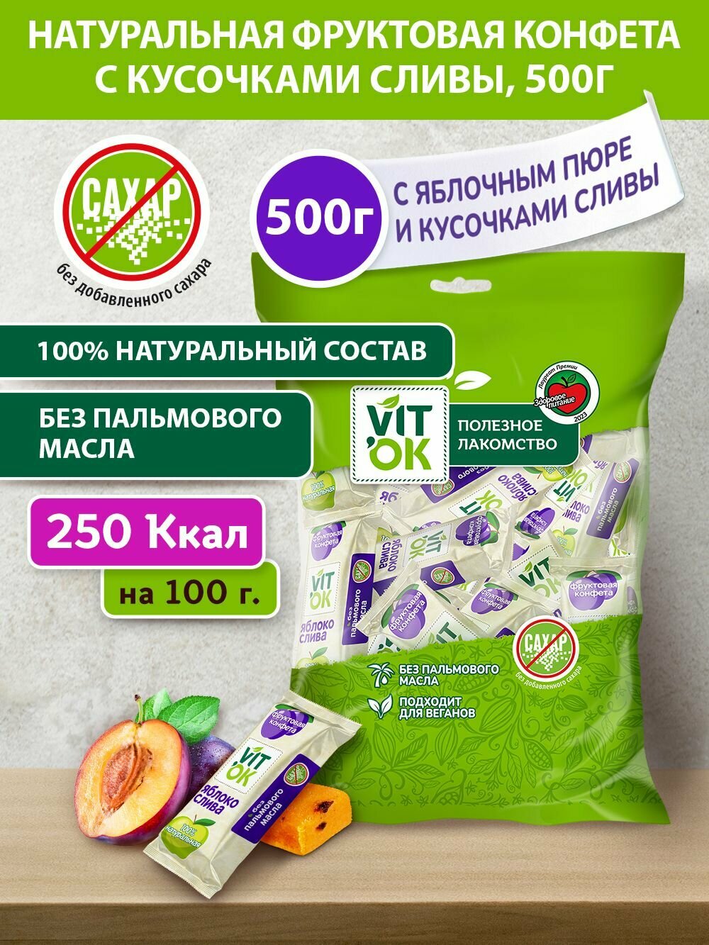 Ниже Вы можете прочитать отзывы на Конфета-батончик фрyктовая Vitok 100% натуральная полезная без сахара с яблочным пюре и кусочками сливы, 500 г, ознакомится с подробными характеристиками, посмотреть интересные обзоры и фотографии на Конфета-батончик фрyктовая Vitok 100% натуральная полезная без сахара с яблочным пюре и кусочками сливы, 500 г.