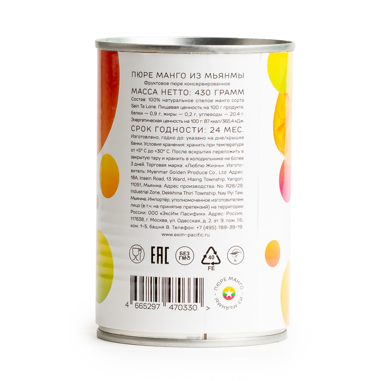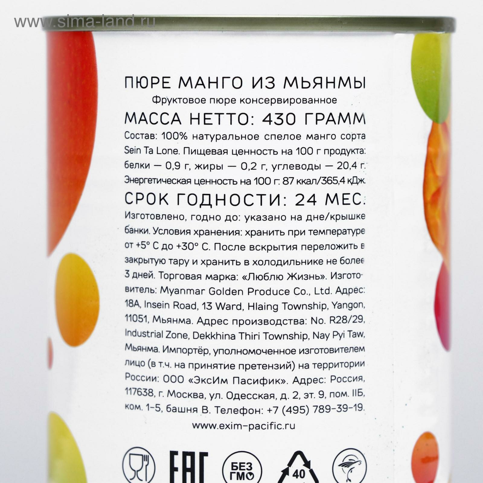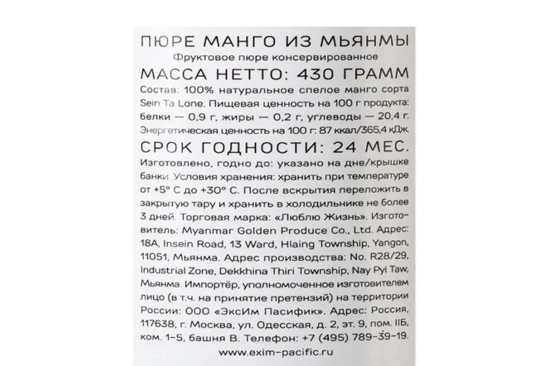 Манго из Мьянмы (пюре) 430 г, ж/б (без сахара)