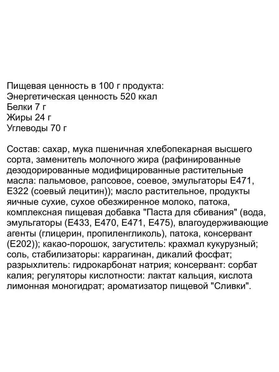| Состав | Сахар, мука пшеничная хлебопекарная высшего сорта, масло растительное, заменитель молочного жира (рафинированные дезодорированные модифицированные растительные масла: пальмовое, рапсовое, соевое, эмульгаторы Е471, Е322 (соевый лецитин)); патока, продукты яичные сухие, сухое обезжиренное молоко, комплексная пищевая добавка "Паста для сбивания" (вода, эмульгаторы (Е433, Е470, Е471, Е475), влагоудерживающие агенты (глицерин, пропиленгликоль), патока, консервант (Е202)); агент влагоудерживающий: глицерин; загуститель: крахмал кукурузный; разрыхлитель: гидрокарбонат натрия; соль, стабилизаторы: каррагинан, дикалий фосфат; ароматизатор пищевой "Мед", консервант: сорбат калия; регуляторы кислотности: лактат кальция, кислота лимонная моногидрат. |