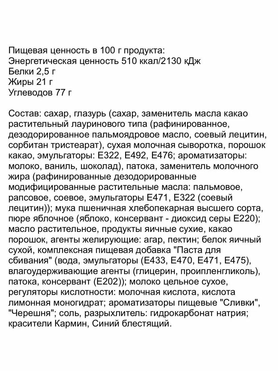| Состав | сахар, глазурь темная (сахар, заменитель масла какао растительный лауринового типа (рафинированное дезодорированное пальмоядровое масло, соевый лецитин, сорбитан тристеарат), сухая молочная сыворотка, порошок какао, эмульгаторы: Е322, Е492, Е476; ароматизаторы: молоко, ваниль, шоколад); пюре яблочное (яблоко, консервант - диоксид серы Е220); мука пшеничная хлебопекарная высшего сорта, патока, масло растительное, продукты яичные сухие, белок яичный сухой, какао-порошок, комплексная пищевая добавка "Паста для сбивания" (вода, эмульгаторы (Е433, Е470, Е471, Е475), влагоудерживающие агенты (глицерин, пропиленгликоль), патока, консервант (Е202)); агенты желирующие: агар, пектин; агент влагоудерживающий: глицерин; ароматизаторы пищевые "Ваниль-сливки", "Черешня", регуляторы кислотности: кислота лимонная моногидрат, молочная кислота; соль, красители пищевые Кармин, Синий блестящий, разрыхлитель: гидрокарбонат натрия. |