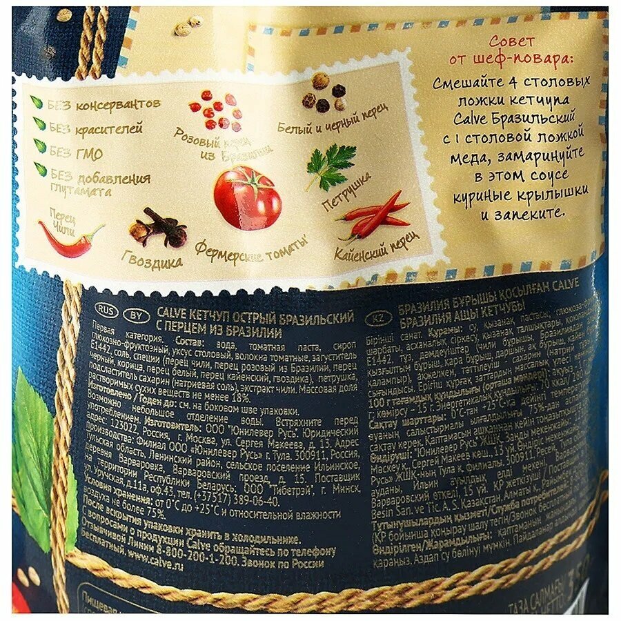 | Дополнительная информация | Комплектация: «Calve», кетчуп «Бразильский», 2 шт по 350 г Срок годности: 9 месяцев |