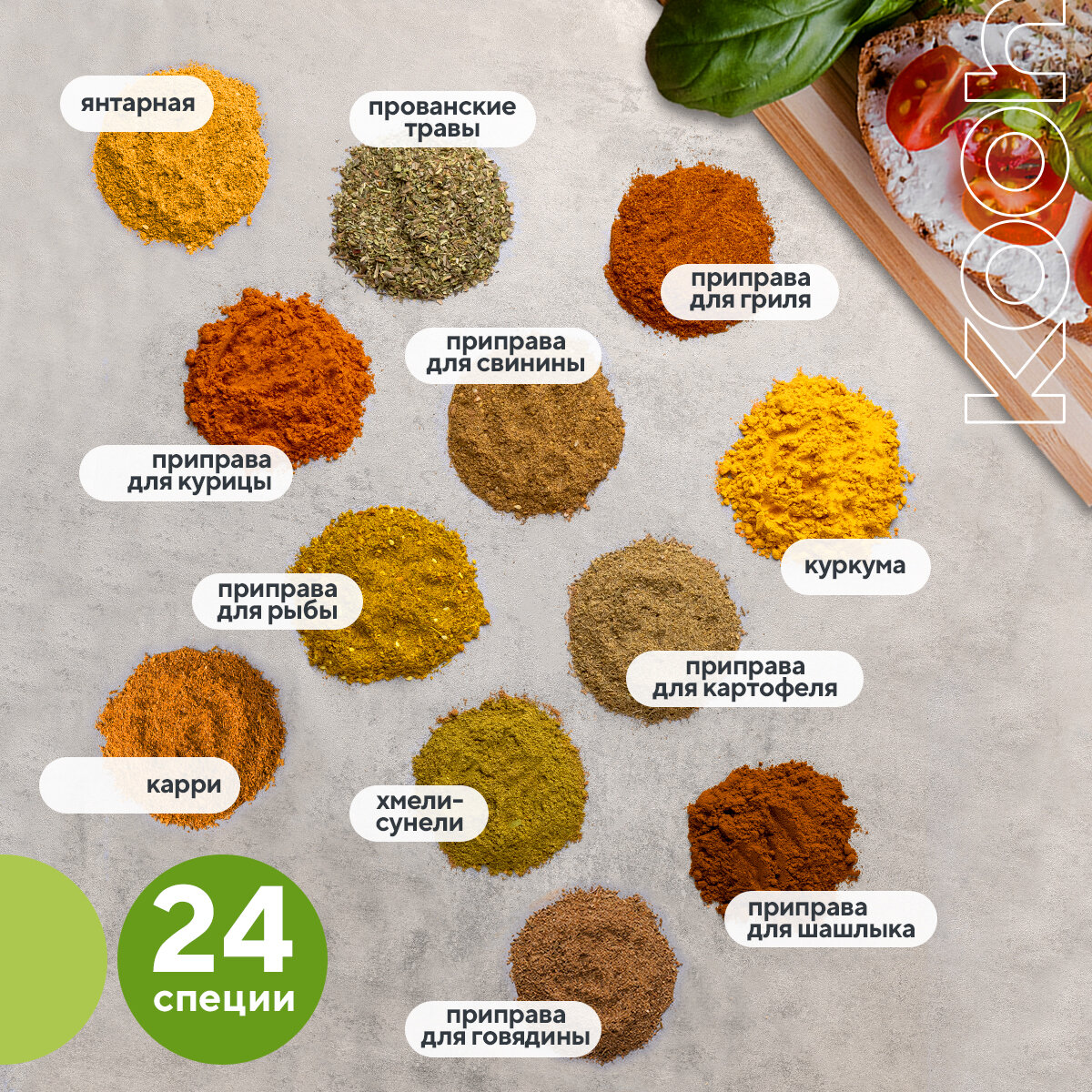 | Вид специи / пряности | базилик / барбарис / гвоздика / имбирь / карри / кориандр / кумин / куркума / лавровый лист / лук / майоран / морковь / мускатный орех / мускатный цвет / орегано / пажитник / паприка / перец душистый / перец красный / перец черный / перец чили / петрушка / розмарин / семена горчицы / смесь трав / тмин / томат / укроп / хмели-сунели / чабер / чеснок |