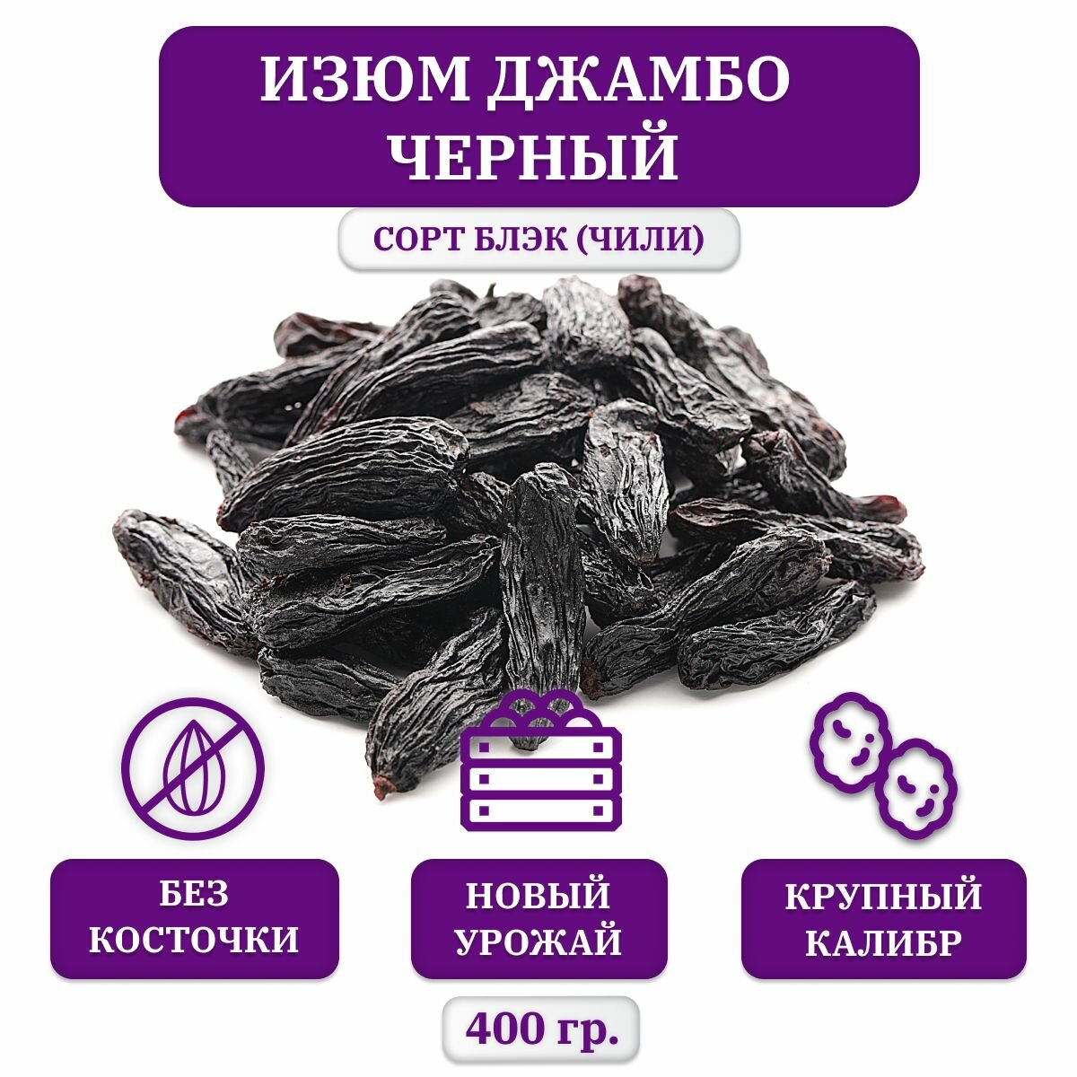 Купить Изюм тёмный, Джамбо Блэк, без косточек, Чили, 400 гр.