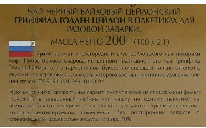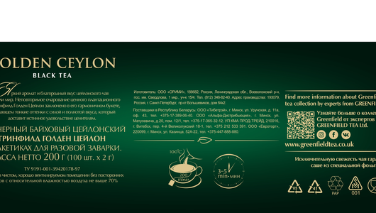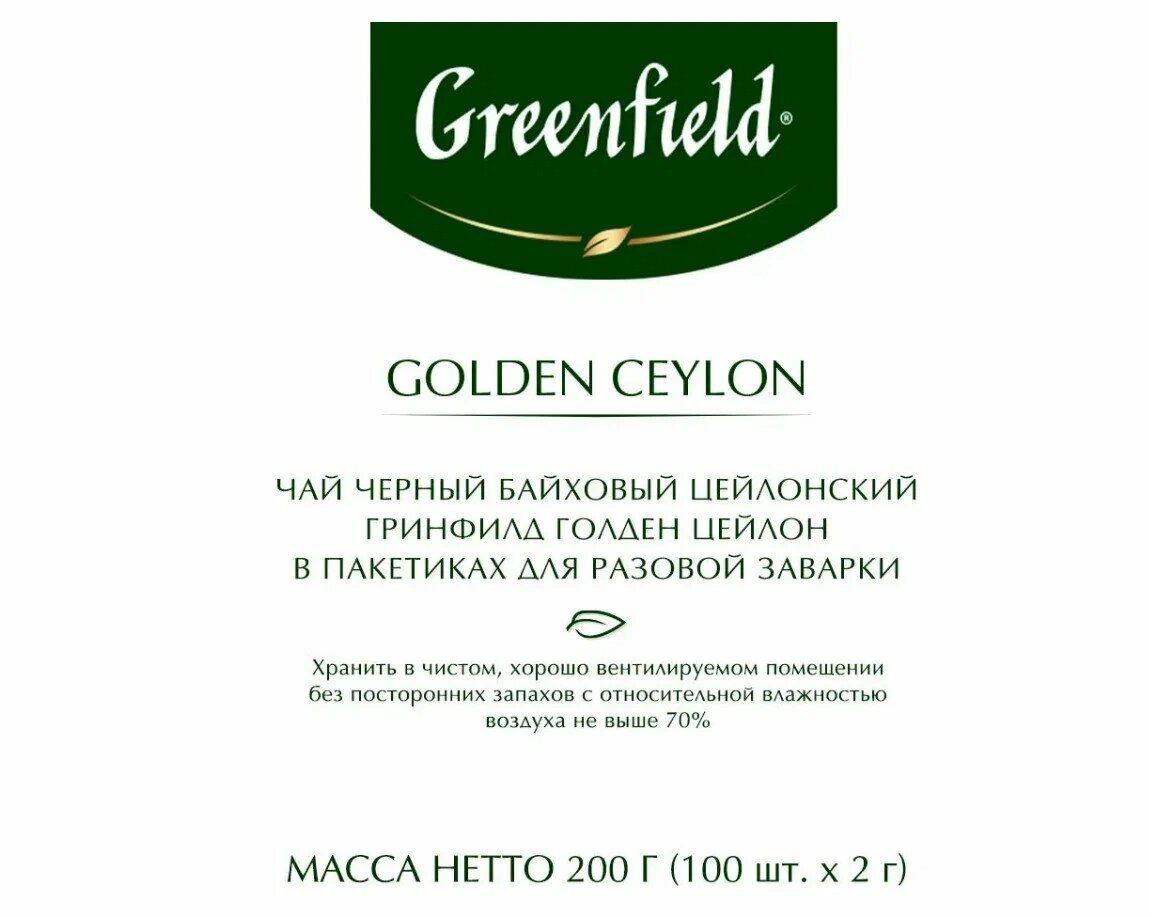 | Состав набора | Гринфилд Голден Цейлон чай черный пакетированный, 100 пакетиков по 2 г |