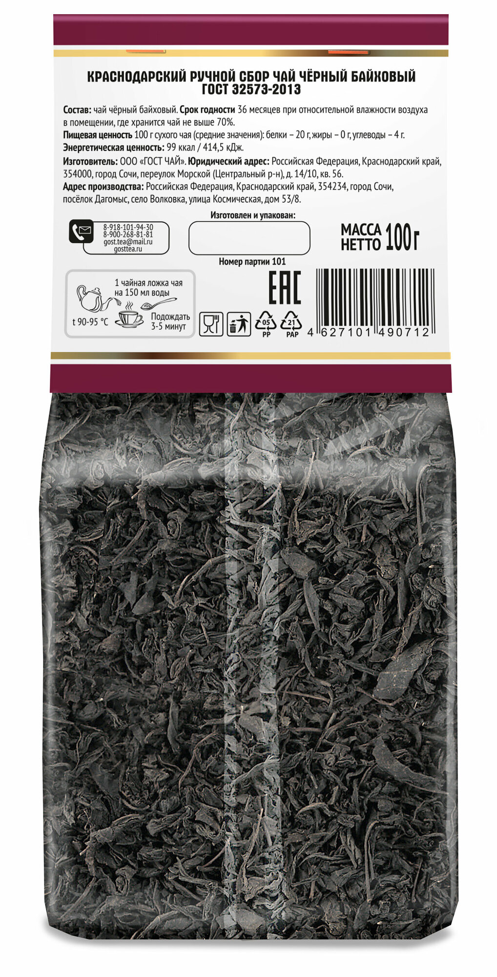Чай черный краснодарский ГОСТ ЧАЙ ручной сбор листовой, 100г