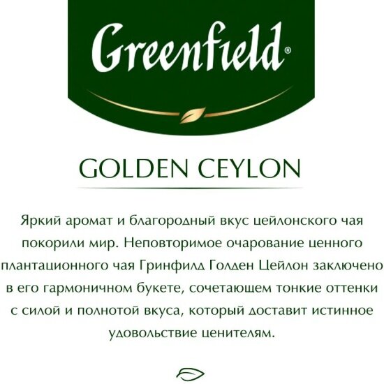 Ниже Вы можете прочитать отзывы на Чай Greenfield Golden Ceylon 100 г, листовой черный, ознакомится с подробными характеристиками, посмотреть интересные обзоры и фотографии на Чай Greenfield Golden Ceylon 100 г, листовой черный.