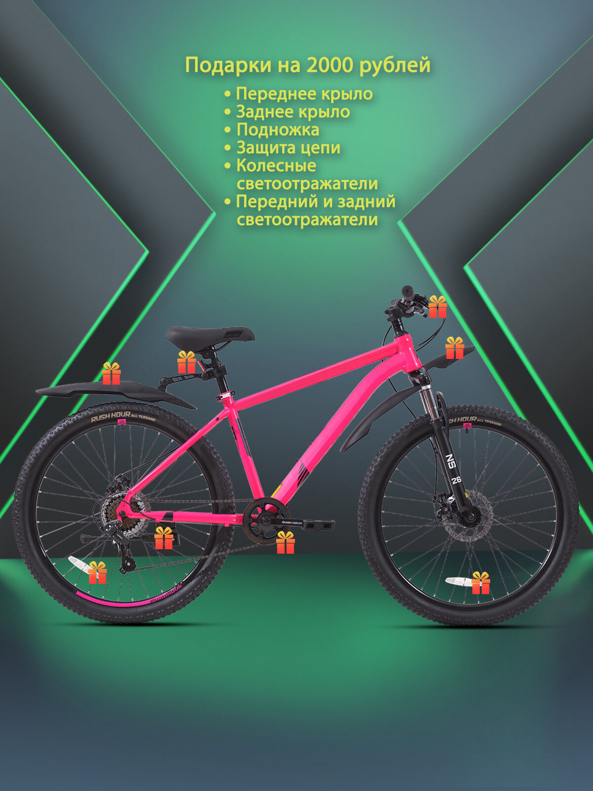 Купить Велосипед горный дисковый 26" рост 140-155см 7 скоростей розовый рама 14" велик 8 лет 9 лет 10 лет переключатель SHIMANO скоростной RUSH HOUR NX 605
