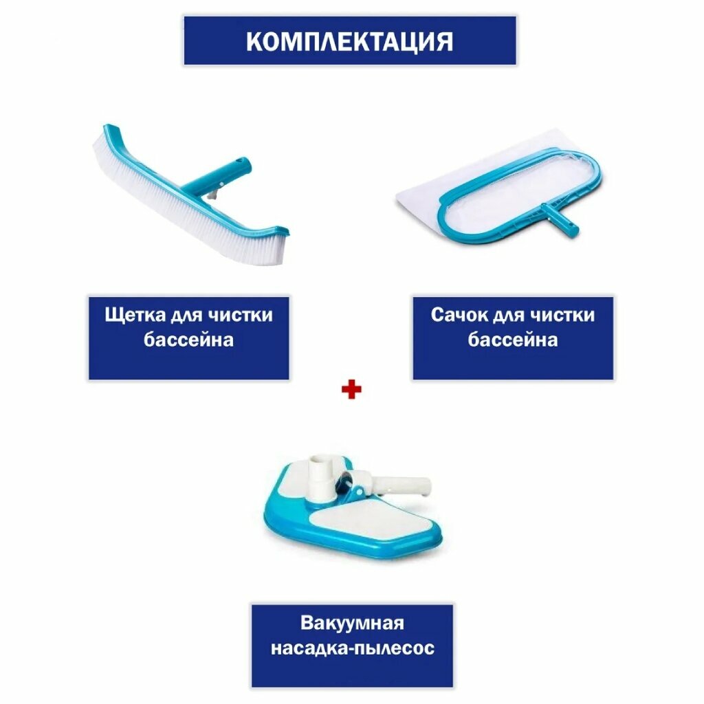 | Комплектация | сачок для сбора мусора на поверхности воды, щетка для чистки стенок и дна бассейна, специальная вакуумная насадка для сбора мусора |