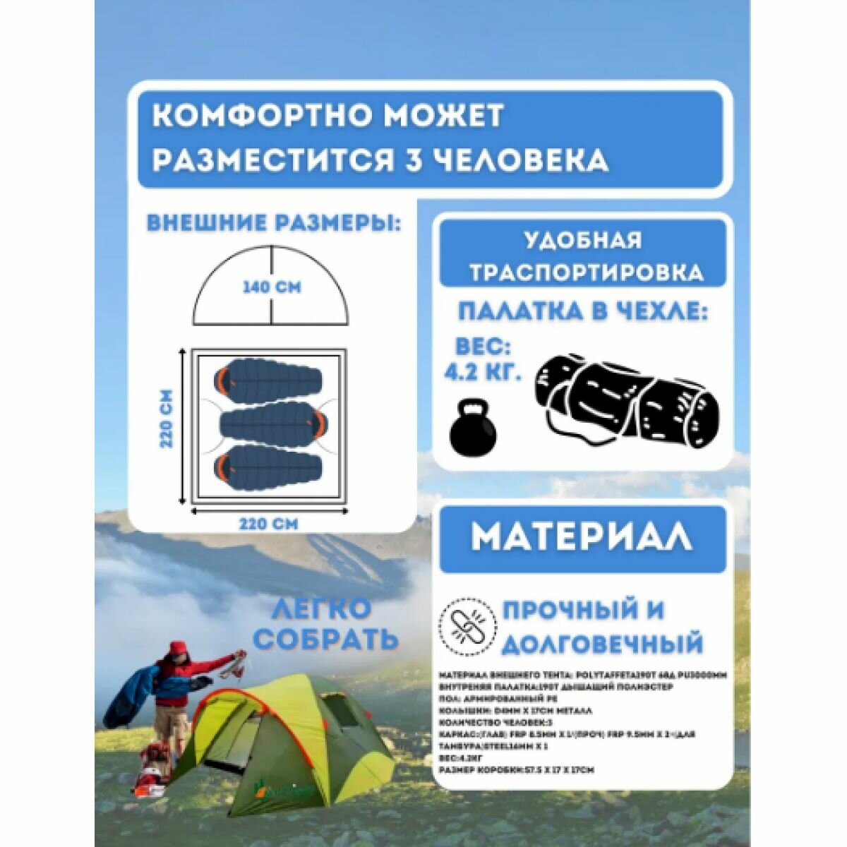 | Габариты внешней палатки(ДxШxВ) | 220x310x140 cм |