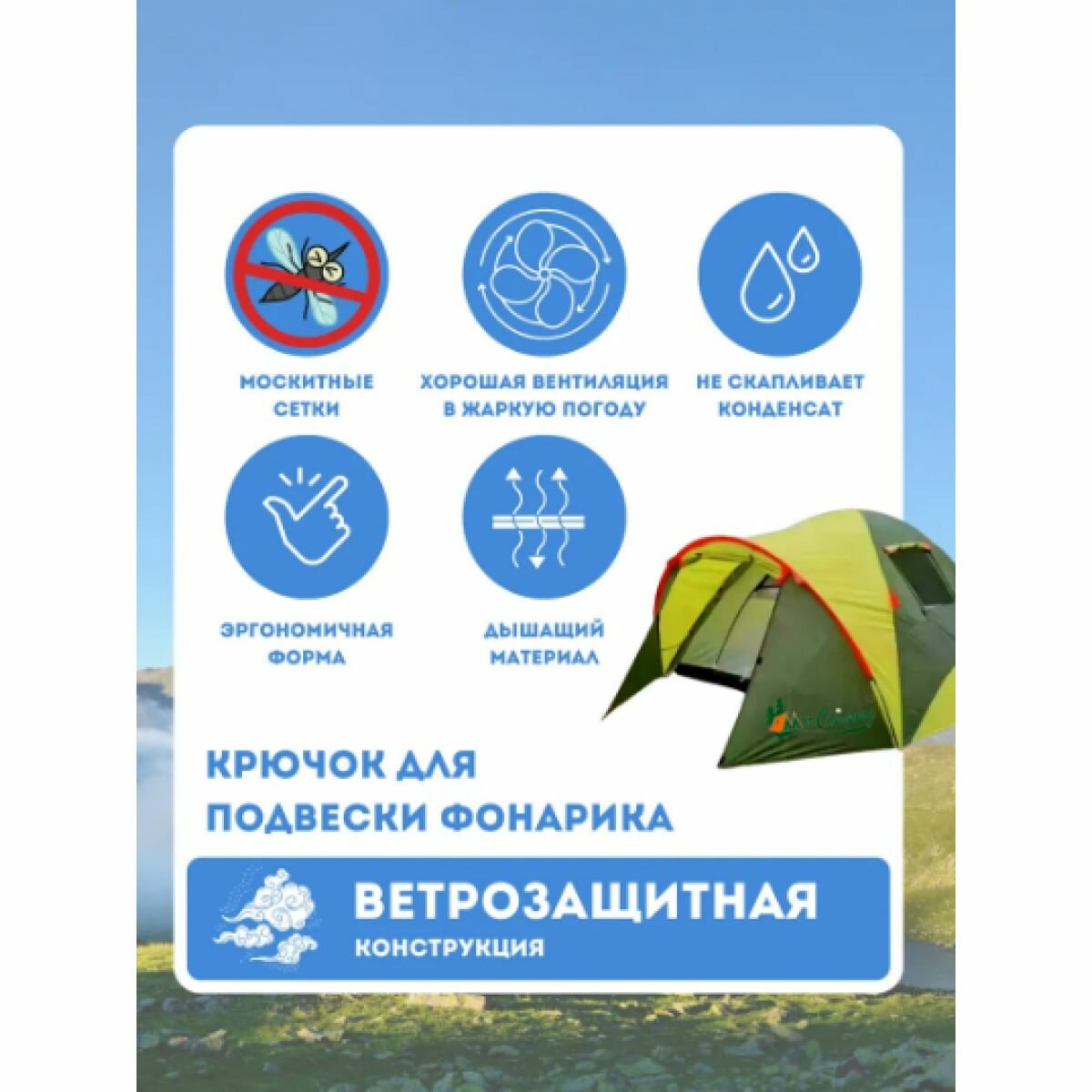 | Особенности | 1 комната / вентиляционные отверстия / ветрозащитная/снегозащитная юбка / внутренние карманы / внутренняя палатка / Возможность крепления фонарика / колышки / огнеупорная пропитка / окна / проклеенные швы / противомоскитная сетка / тамбур / тент / штормовые оттяжки |