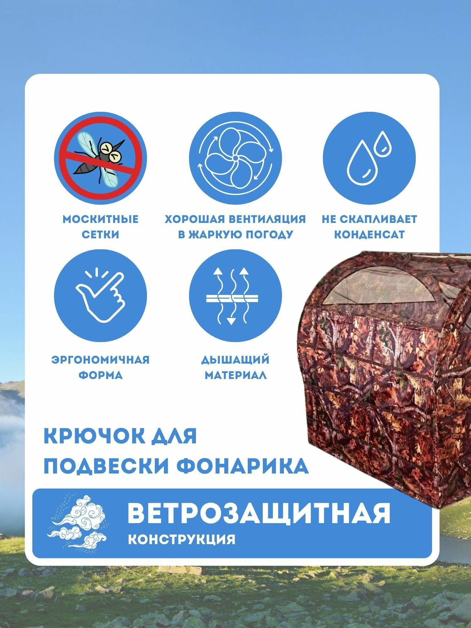 | Особенности | 1 комната / вентиляционные отверстия / ветрозащитная/снегозащитная юбка / внутренние карманы / внутренняя палатка / Возможность крепления фонарика / колышки / огнеупорная пропитка / окна / проклеенные швы / противомоскитная сетка / тамбур / тент / штормовые оттяжки |
