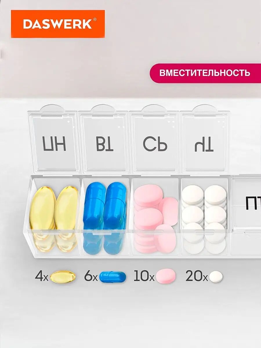 | Дополнительная информация | Таблетница/контейнер-органайзер для лекарств и витаминов DASWERK 7 дней/2 приема Maxi - 1 шт |