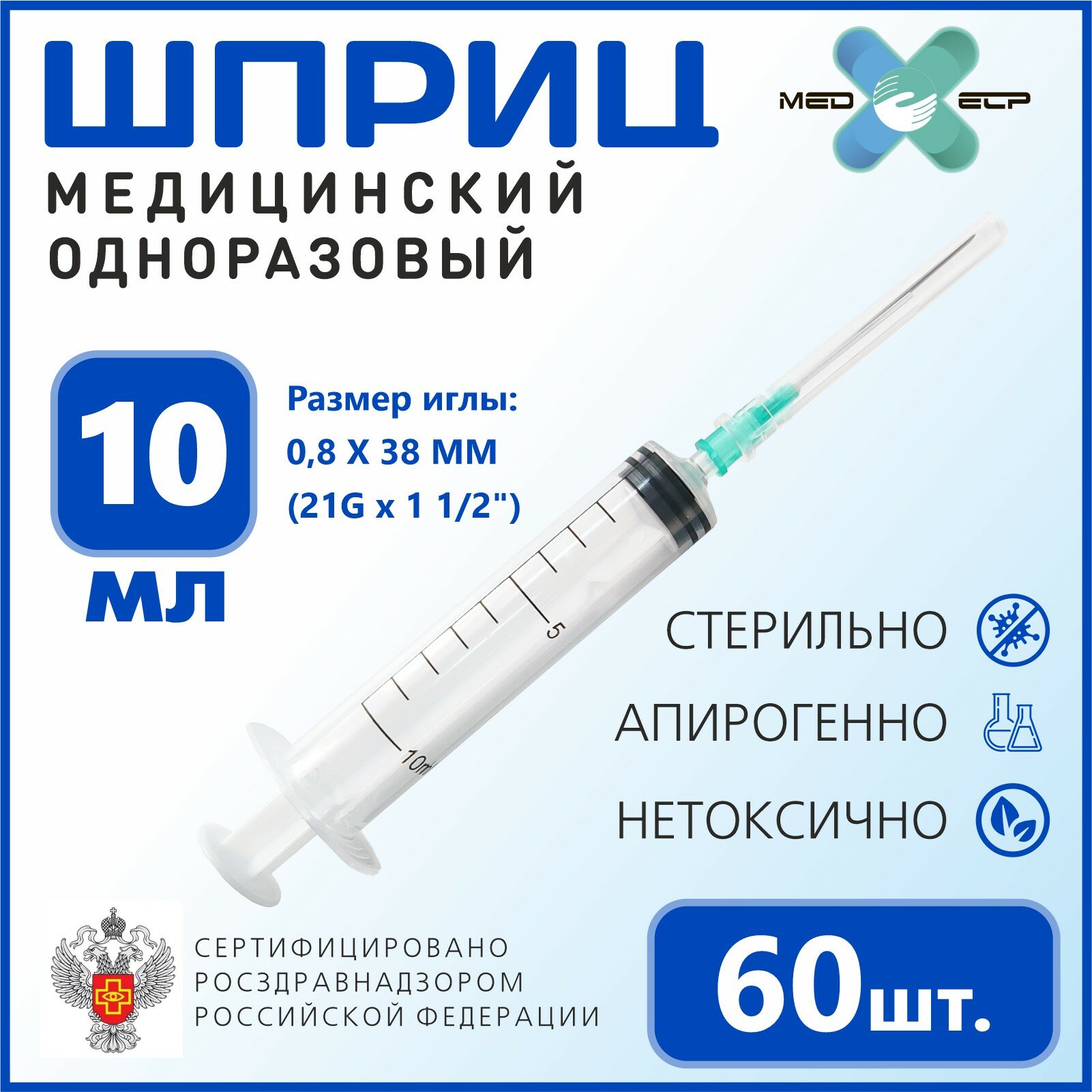 Купить Шприц Med elp 10 мл с иглой G21 (0,8*38 мм) 60 штук 3-ех. комп. одноразовый стерильный