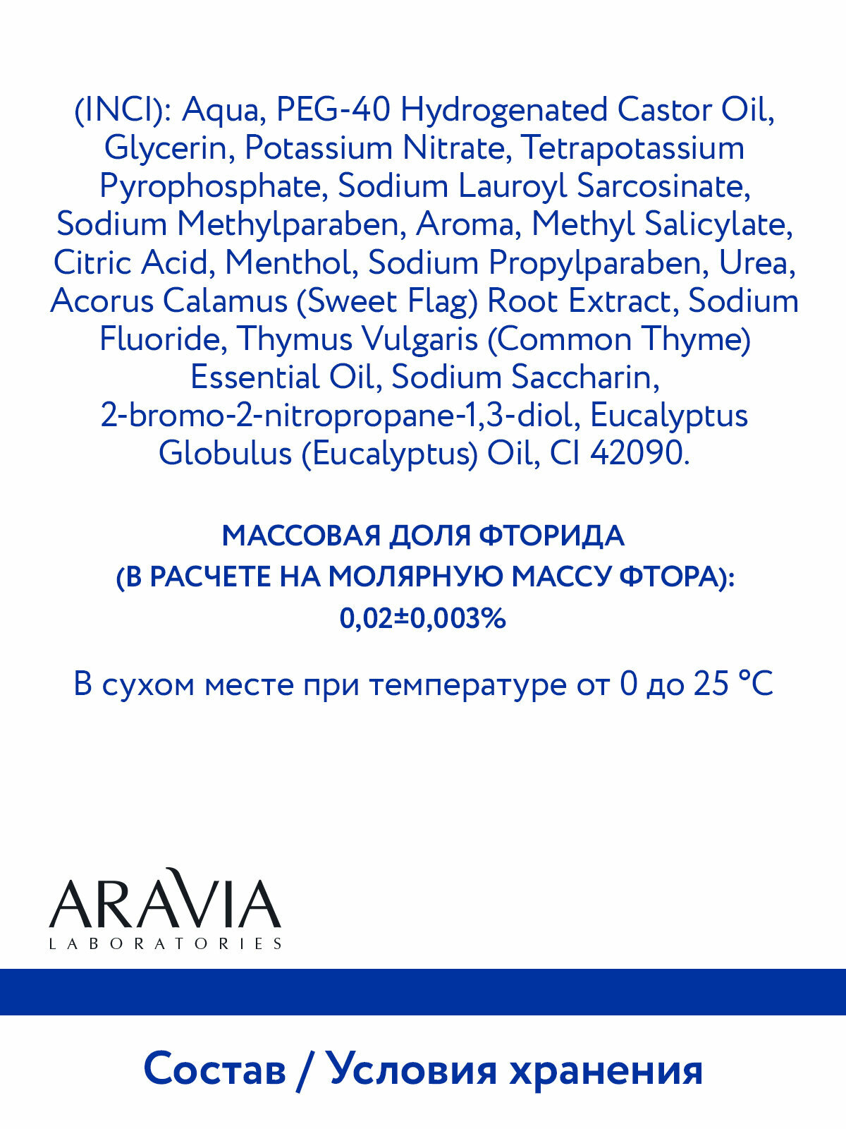 | Состав | Aqua, PEG-40 Hydrogenated Castor Oil, Glycerin, Potassium Nitrate, Tetrapotassium Pyrophosphate, Sodium Lauroyl Sarcosinate, Sodium Methylparaben, Aroma, Methyl Salicylate, Citric Acid, Menthol, Sodium Propylparaben, Urea, Acorus Calamus (Sweet Flag) Root Extract, Sodium Fluoride, Thymus Vulgaris (Common Thyme) Essential Oil, Sodium Saccharin, 2-bromo-2-nitropropane-1,3-diol, Eucalyptus Globulus (Eucalyptus) Oil, CI 42090 Массовая доля фторида (в расчете на молярную массу фтора): 0,02±0,003% |