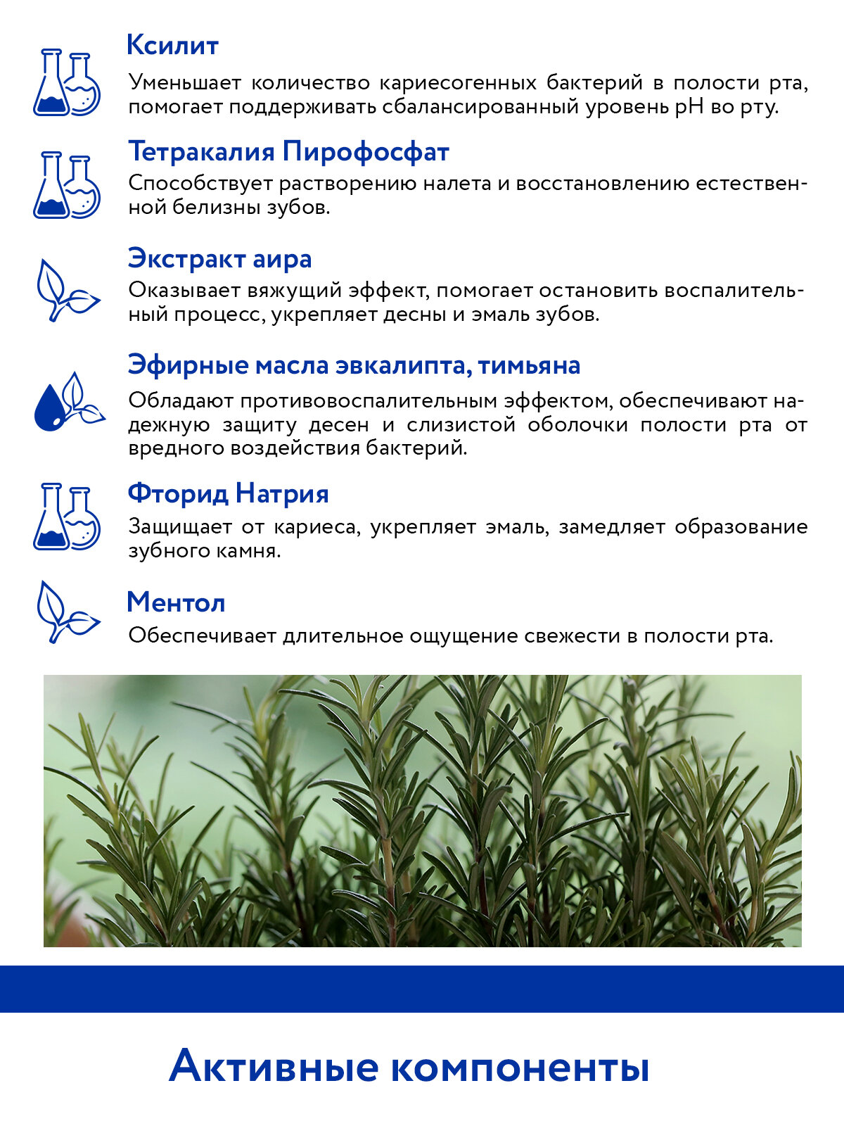 | Дополнительная информация | Ксилит – уменьшает количество кариесогенных бактерий в полости рта, помогает поддерживать сбалансированный уровень рН во рту. Тетракалия Пирофосфат – способствует растворению налета и восстановлению естественной белизны зубов. Фитоактивный комплекс – обладет успокаивающим, смягчающим, восстанавливающим, тонизирующим и противовоспалительным действием, оказывает укрепляющее и успокаивающее действия на десны. Эфирное масло мяты – обладает успокаивающими свойствами. Фторид Натрия – защищает от кариеса, укрепляет эмаль, замедляет образование зубного камня. Ментол – обеспечивает длительное ощущение свежести в полости рта. |