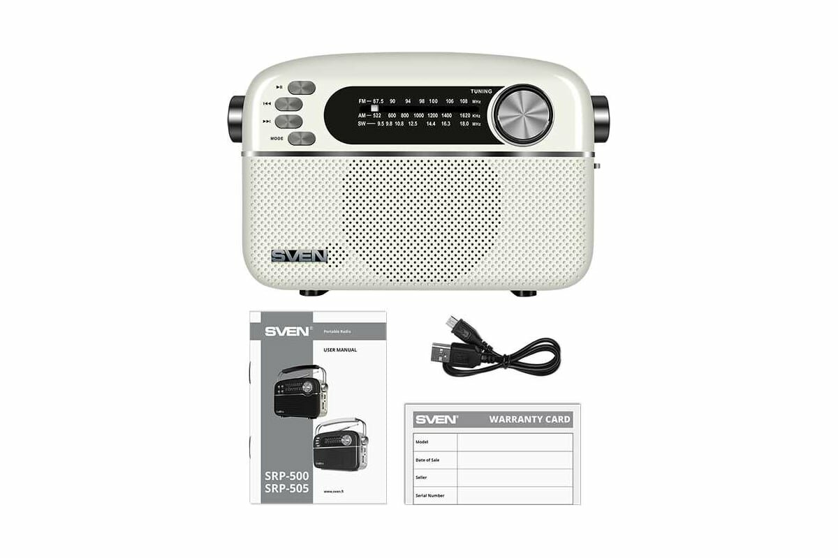 Радиоприемник SVEN SRP-505, белый (3 Вт, Bluetooth, FM/AM/SW, USB, microSD, AUX, встроенный аккумулятор) интересное: