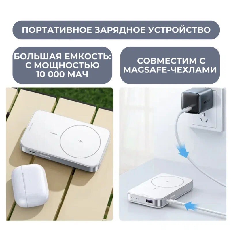 Внешний аккумулятор Ugreen PB206 (25154) White, 10000мАЧ, повербанк, повербанк для айфона, powerbank, павербанк, повербанк для телефона, магнитный повербанк