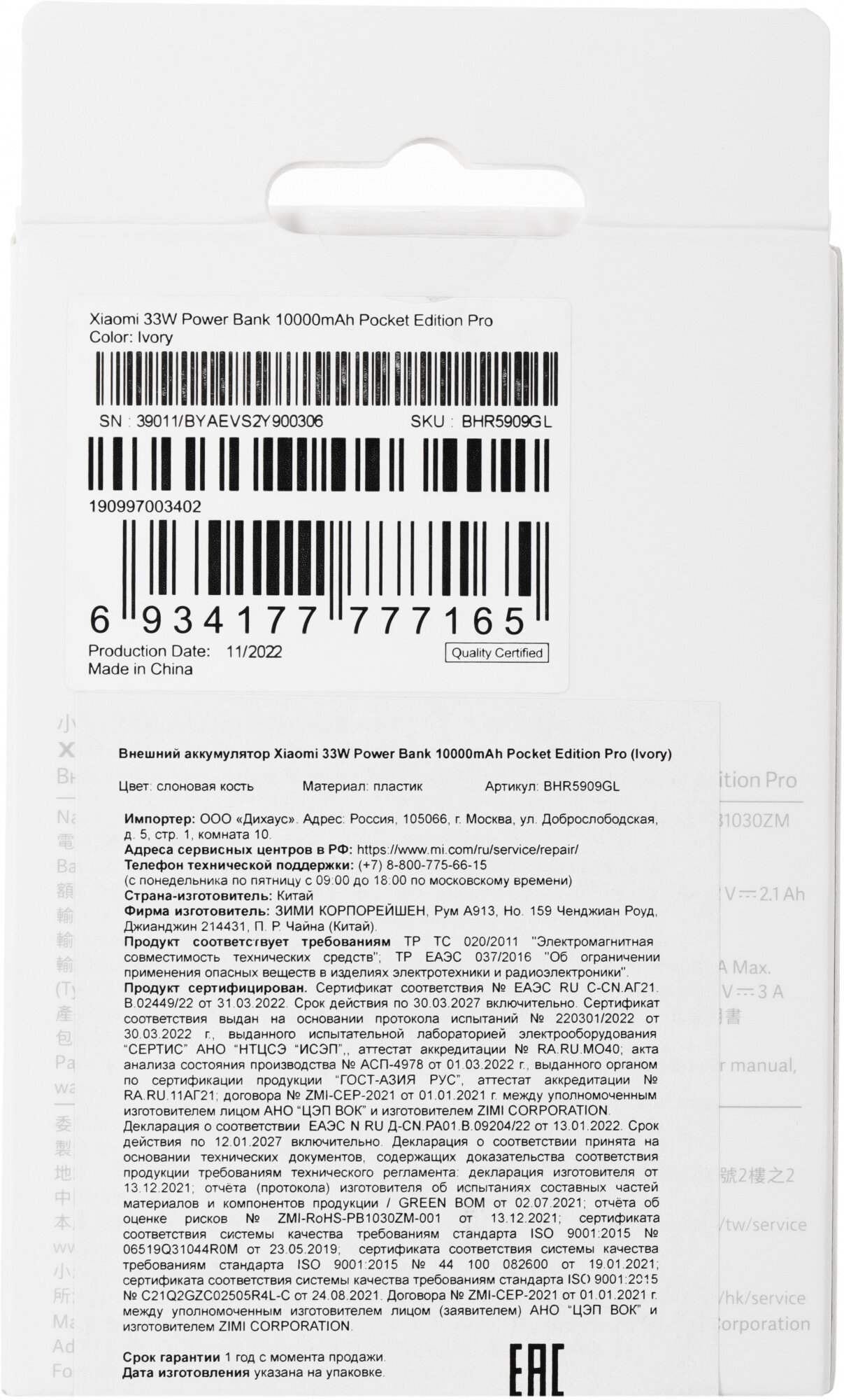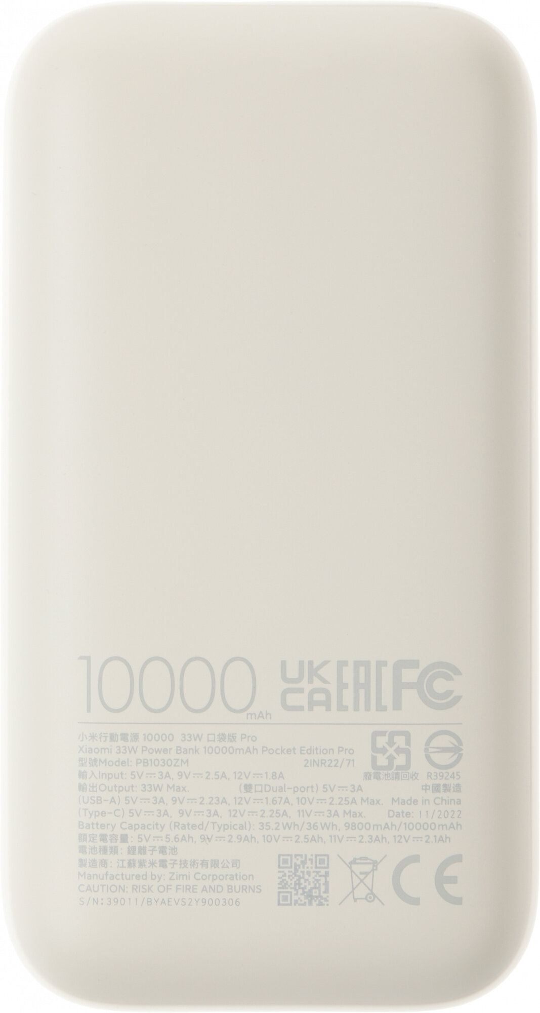Аккумулятор внешний Xiaomi 33W Power Bank10000mAh Pocket Edition Pro (Ivory) PB1030ZM (BHR5909GL)