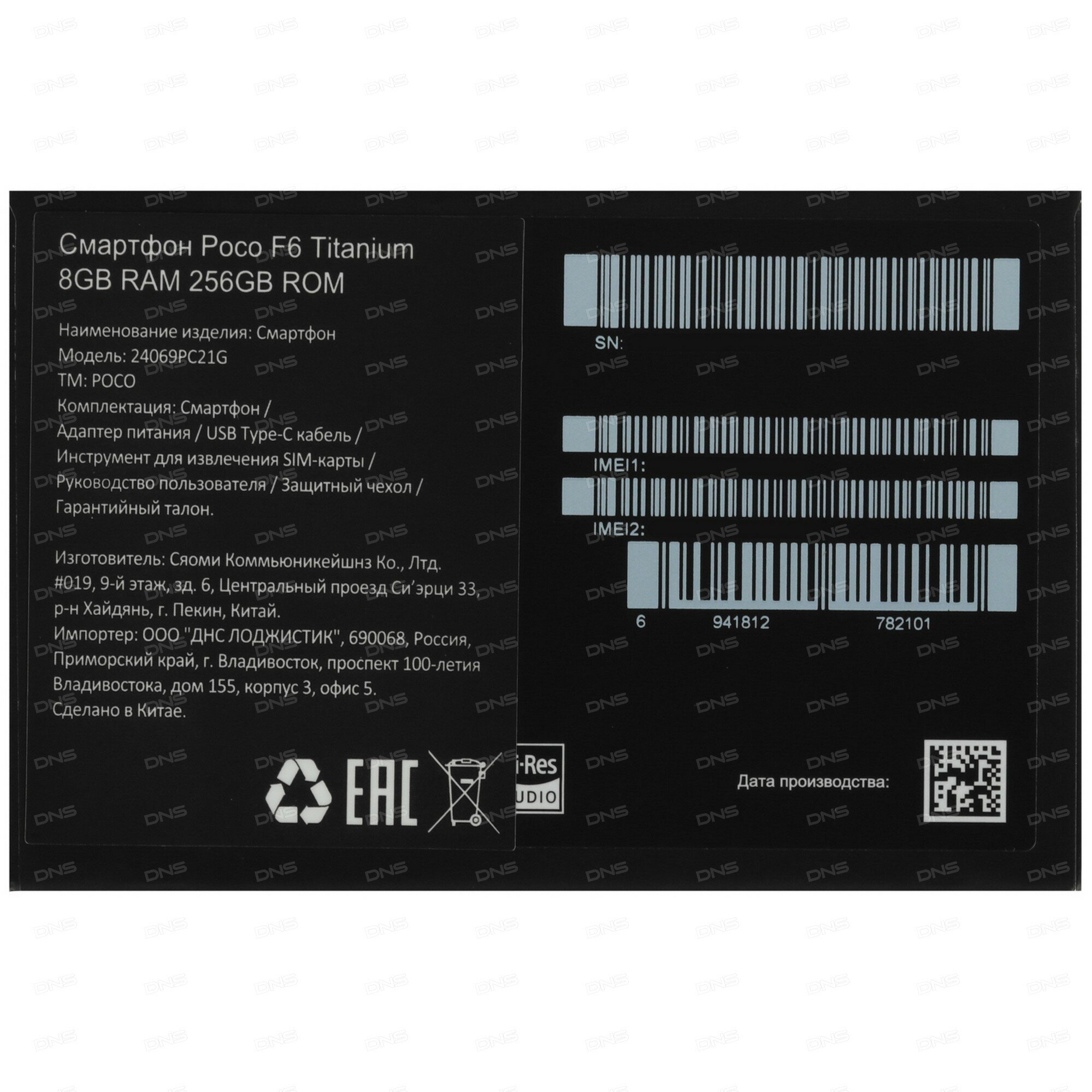 | Заводская комплектация | смартфон Poco F6, адаптер питания, кабель USB Type-C, чехол, сим инжектор, документация |