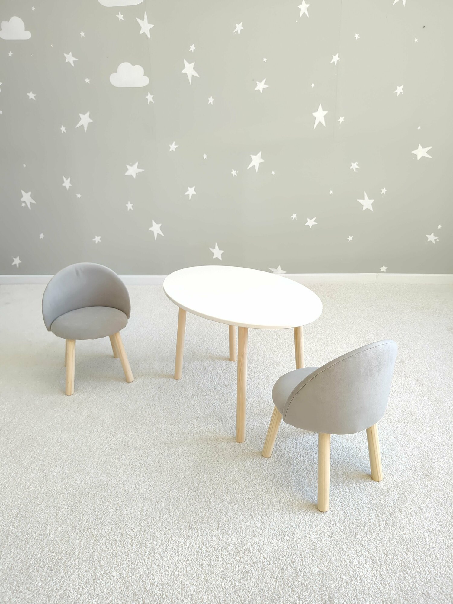 Стол облако белый и два мягких стула серый и розовый